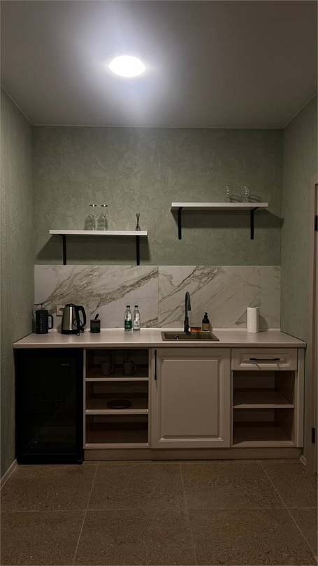 Новый номер с небольшой кухней: холодильник, чайник и посуда — всё под рукой. Номер с одной двуспальной кроватью и собственной террасой.