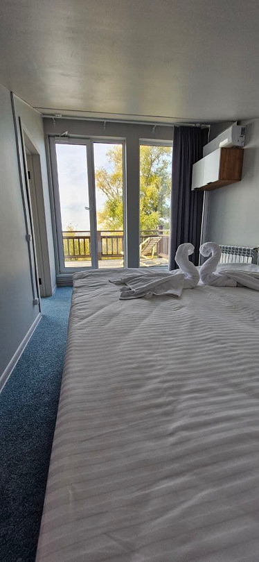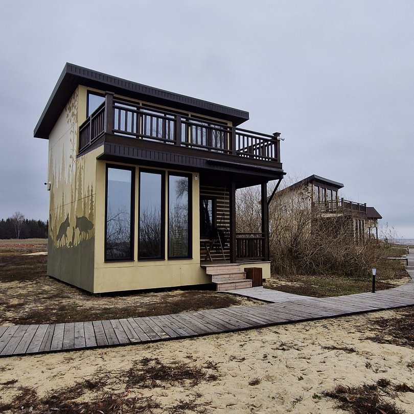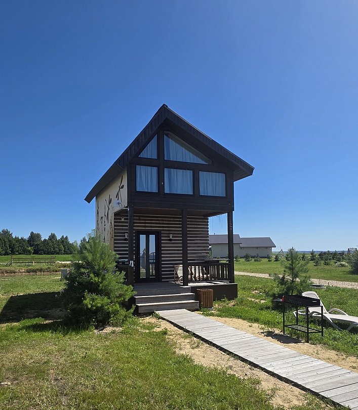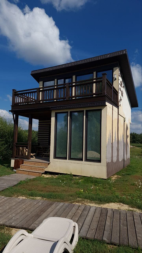 Дом №2 с большим балконом 4 взрослых + 2 ребёнка (бесплатно). Мангальная зона (мангал, уголь, розжиг, стол разделочный), завтрак (в домик или в кафе), детская площадка, футбольное, волейбольное поле (мячи предоставляются), большая территория для прогулки, рыбалка (снасти для рыбалки ваши).