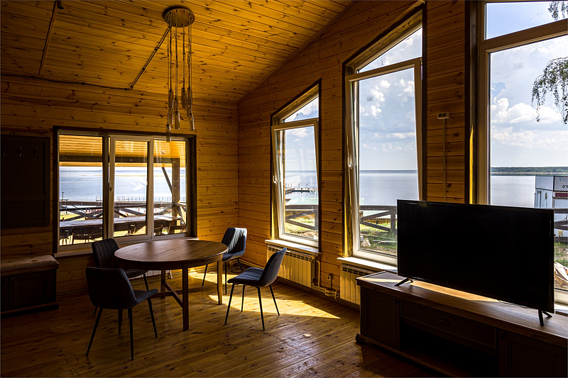Комфортабельный коттедж на берегу Рыбинского водохранилища. В коттедже полностью оборудованная кухня-гостиная, две раздельные спальни на 4 человека, в одной из спален кресло-кровать, санузел с душевой кабиной. В гостиной большой раскладывающийся диван. Терраса с видом на море и своя большая мангальная зона. Прекрасно подходит для компании 4-6 человек.