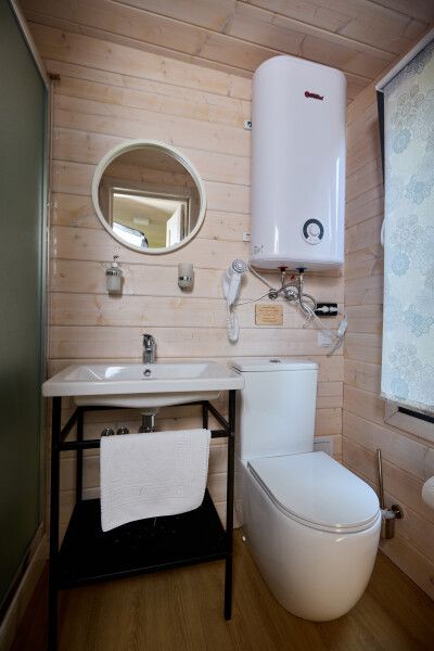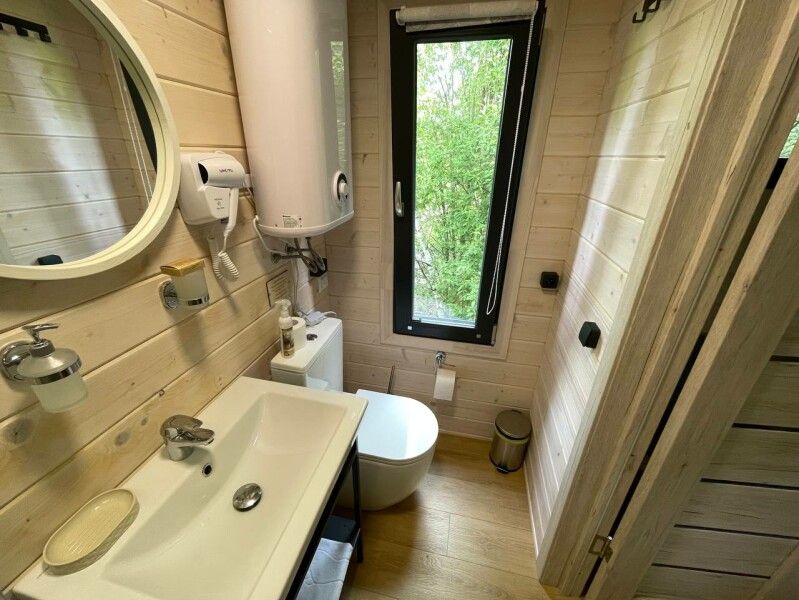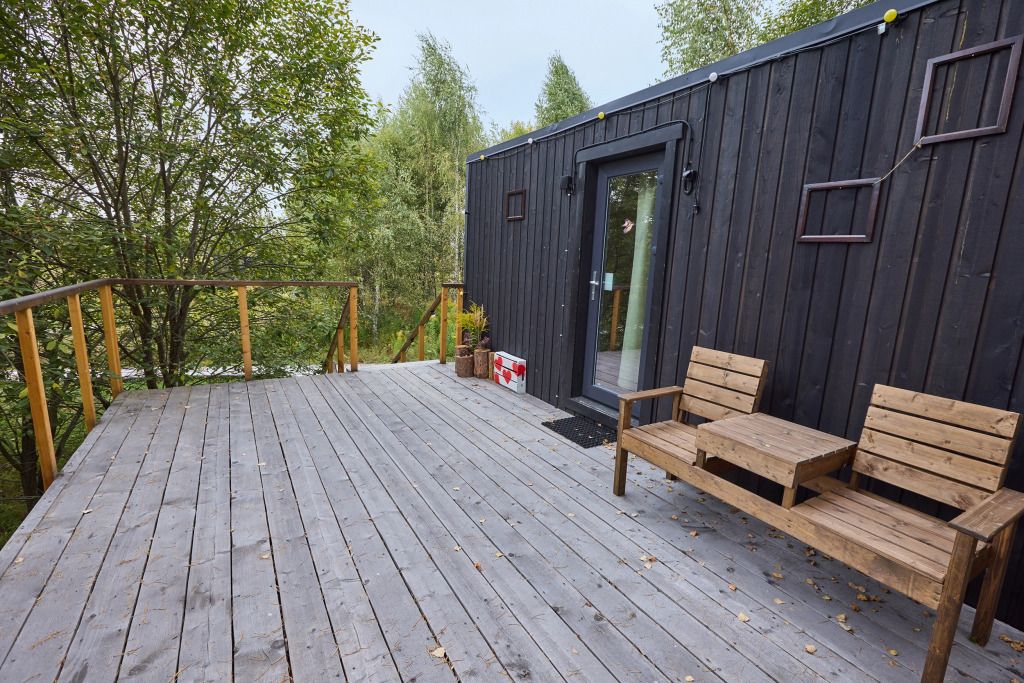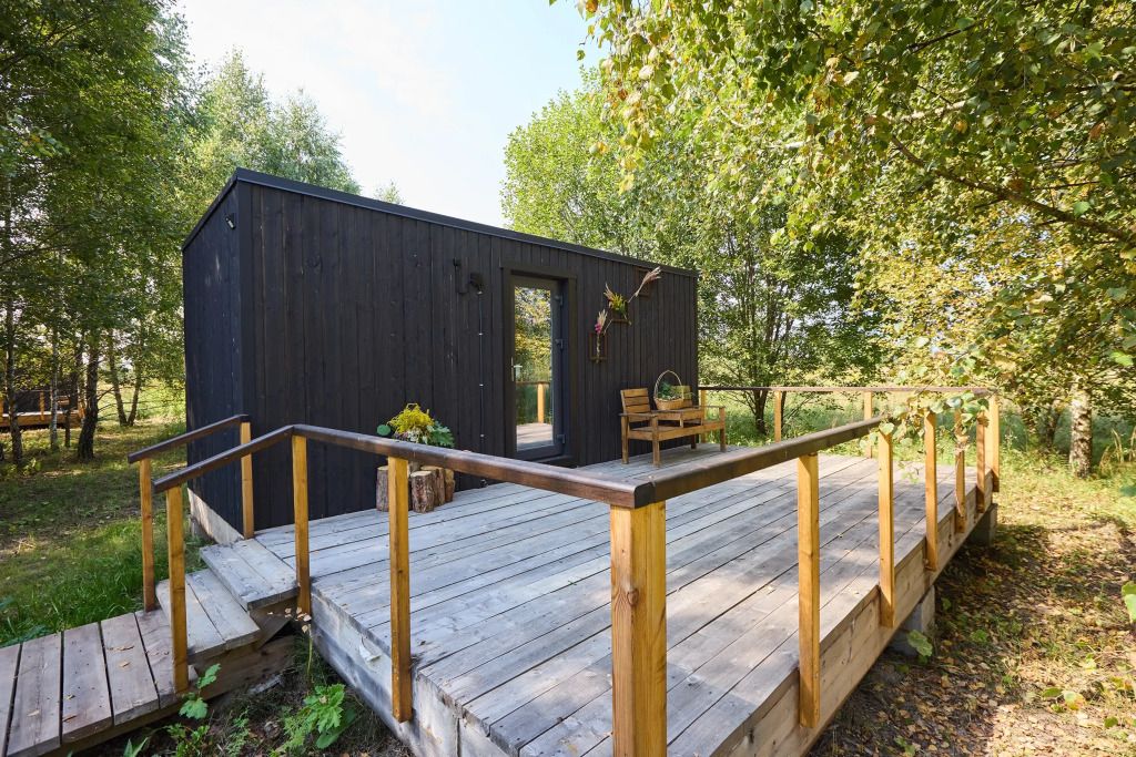 Домик имеет собственную террасу, при выходе на которую вы оказываетесь среди деревьев. Домики расположены на максимальном удалении от общих зон глэмпинга, в нём можно насладиться тишиной и уединением.