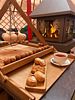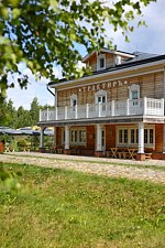Здесь вы ощутите очарование русского стиля во всём: в белых кружевах резных окон, в дубовой мебели, в просторном светлом зале с видом на берёзовую рощу и, конечно же, в русской кухне.