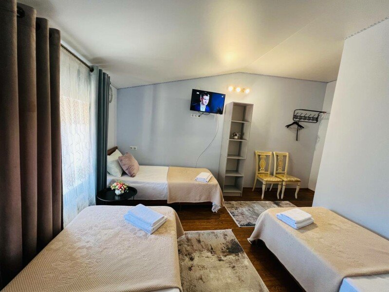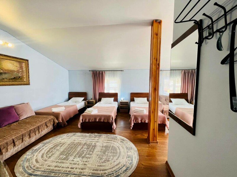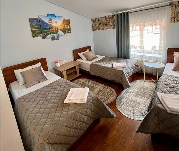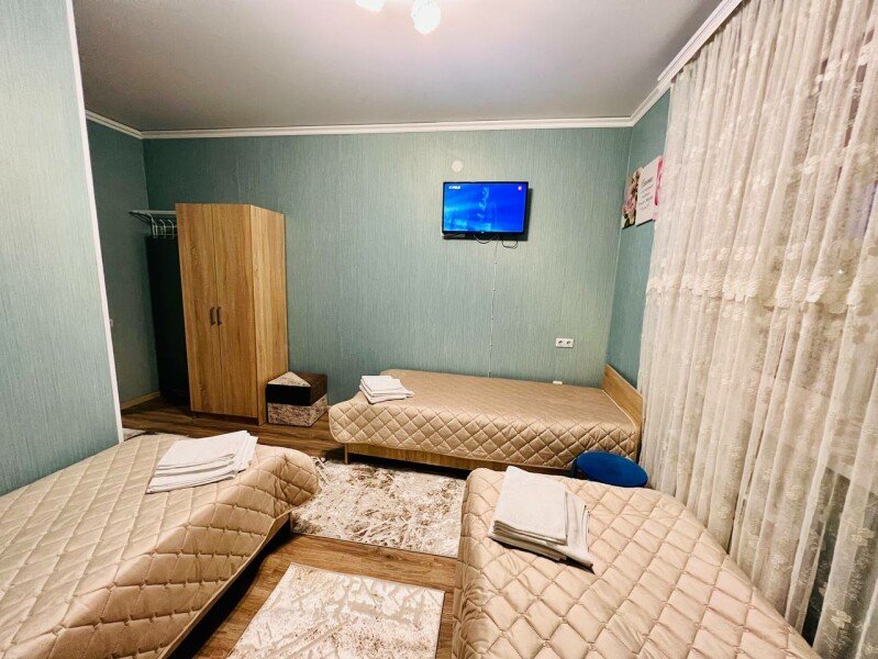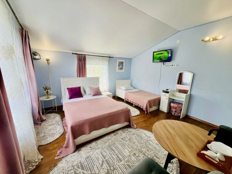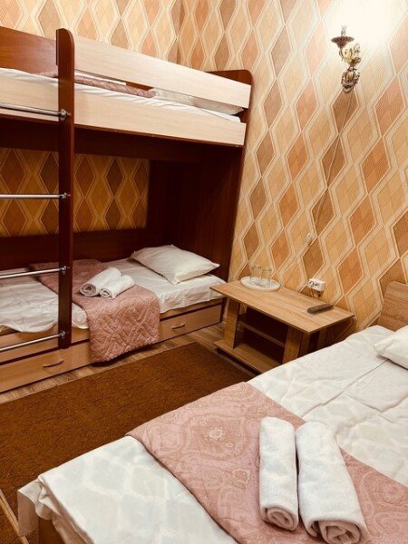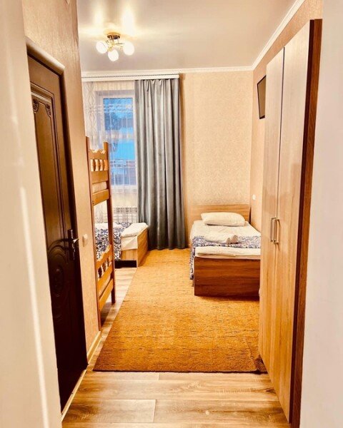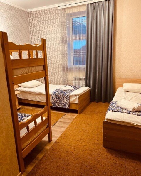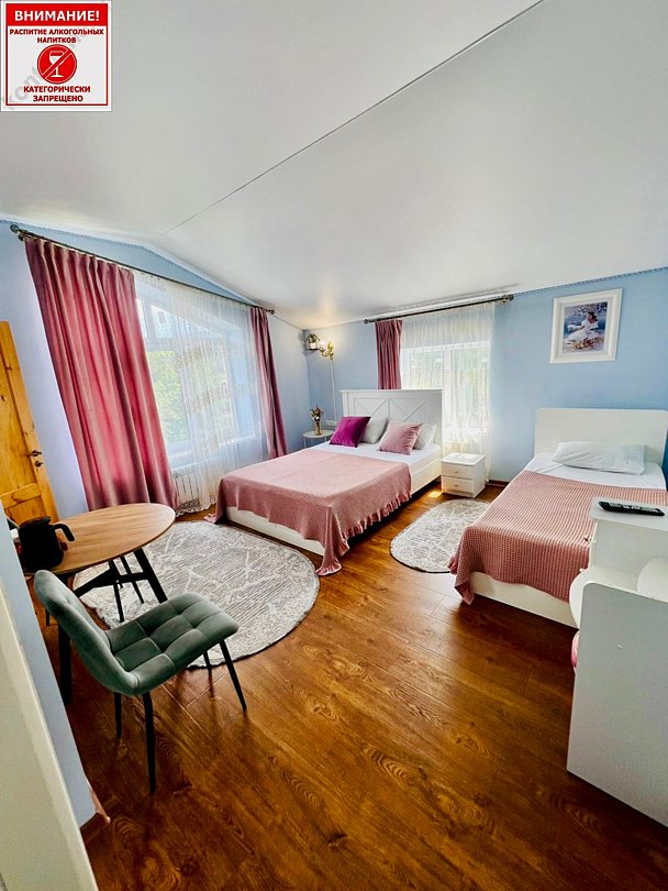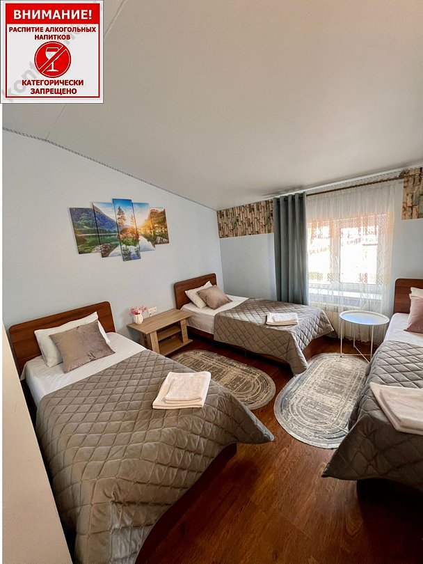 В номере двухъярусная кровать и двуспальная кровать. Во всех номерах ванная комната, все номера оснащены необходимой мебелью: прикроватные тумбочки, столик, шкаф для одежды.