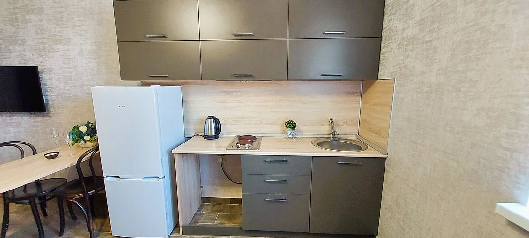 Кухонная зона оборудована электрочайником, электрической плитой, холодильником и посудой. Недалеко есть продуктовые магазины и несколько кафе, столовых для тех, кто не любит готовить самостоятельно.