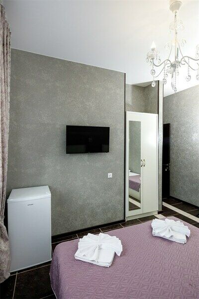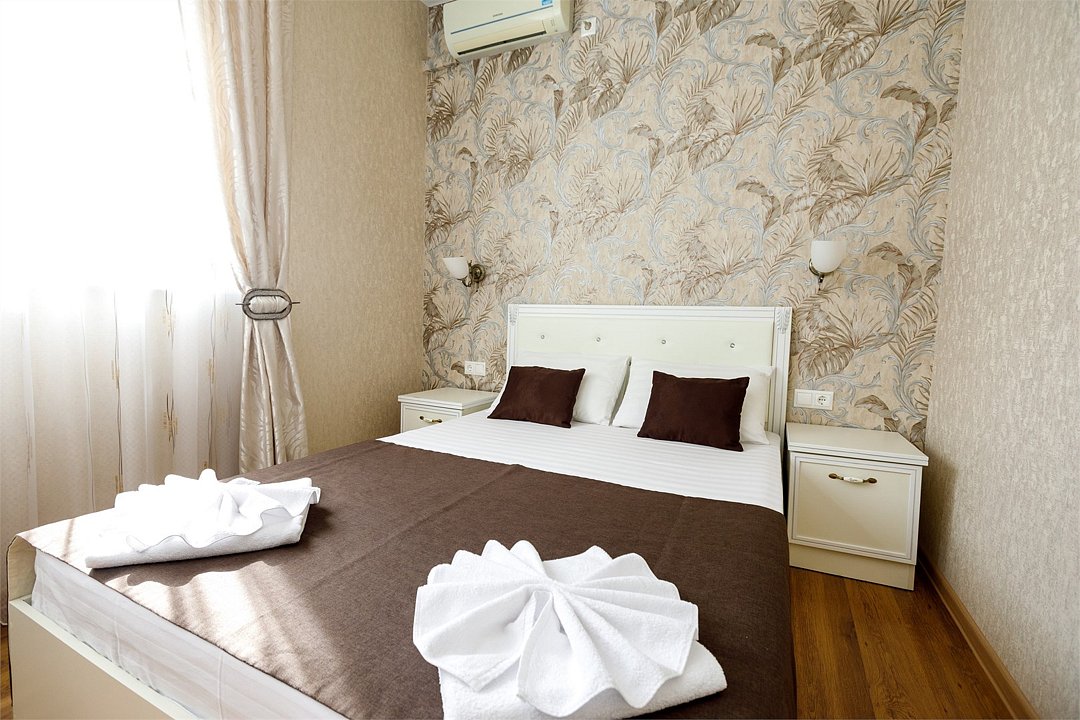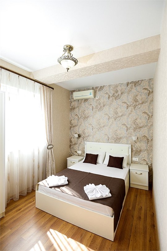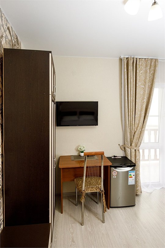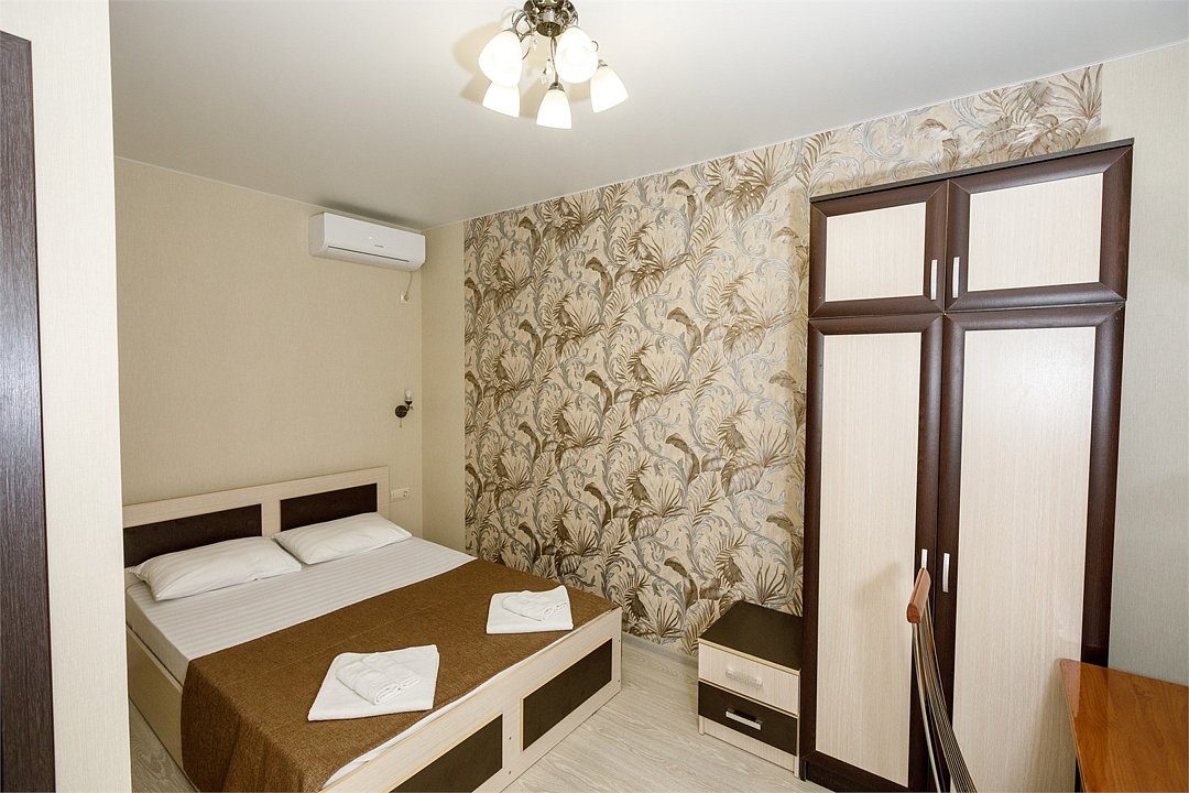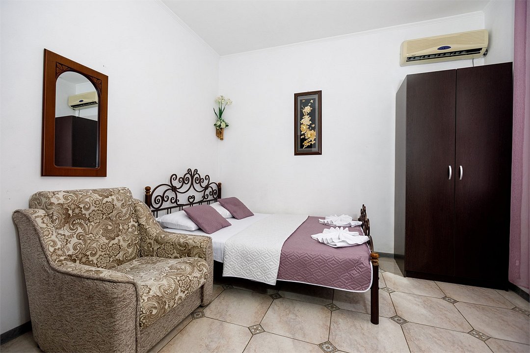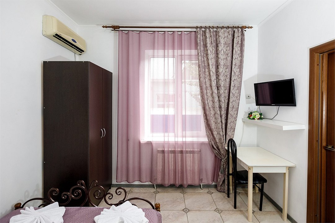 Wi-Fi, холодильник, кондиционер, фен, ванна, банные полотенца, двуспальная кровать, тумбы, шкаф для одежды, вешалки, письменный стол, зеркало, обслуживание номеров, раковина, отдельный вход в номер, вид во двор, стул, туалетные средства, туалет, телевизор с плоским экраном, москитная сеткаВ номере