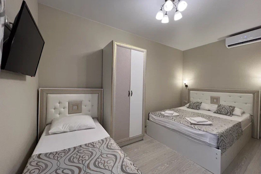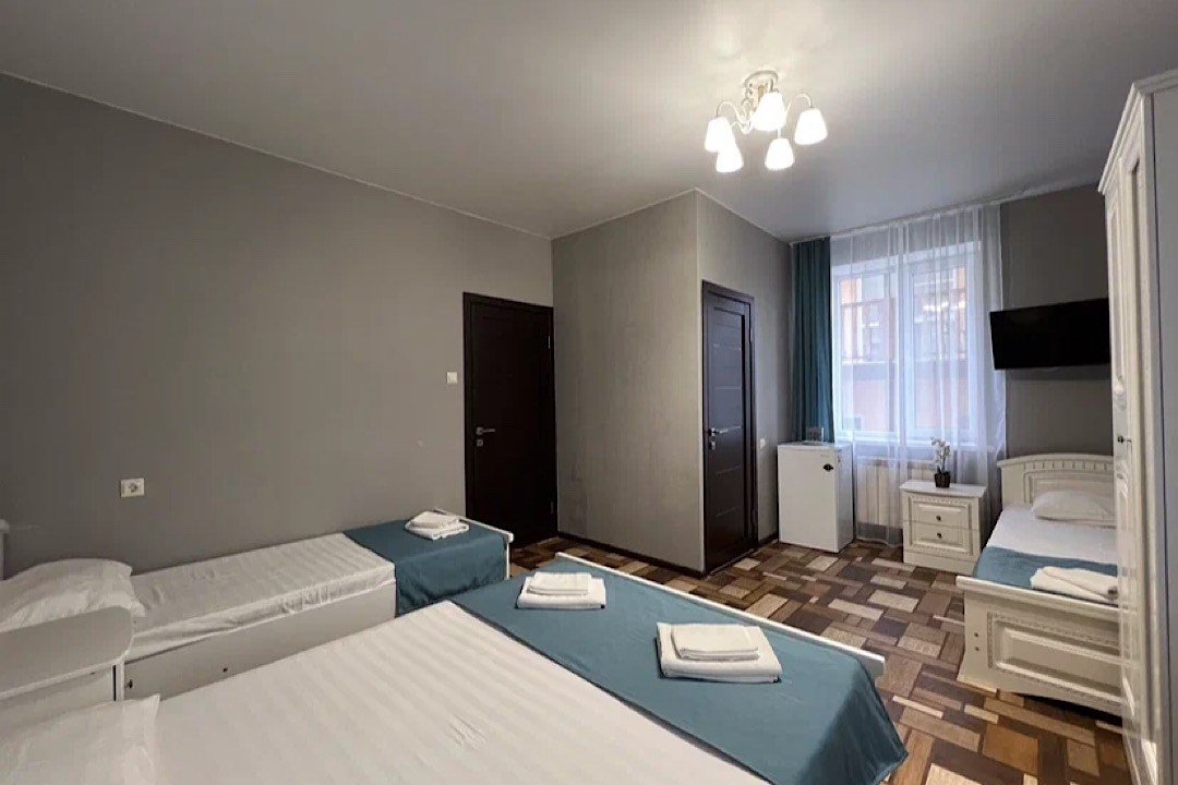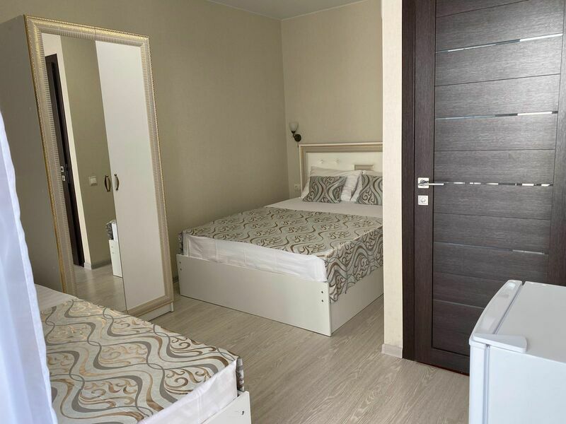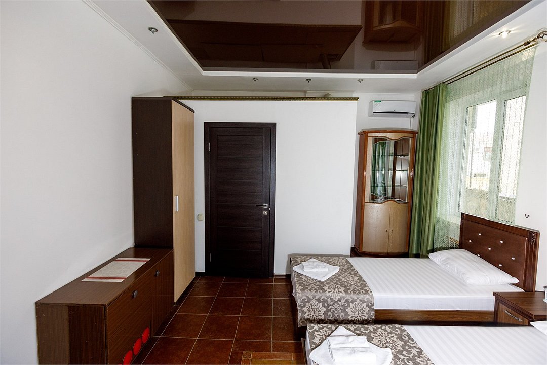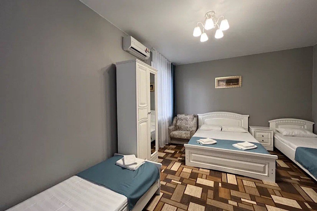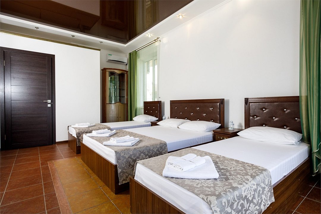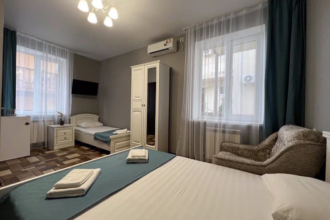 Wi-Fi, холодильник, кондиционер, фен, ванна, банные полотенца, двуспальная кровать, две односпальные кровати, шкаф для одежды, вешалки, журнальный столик, зеркало, пуфики, душ, вид во двор, тумба, туалетные средства, телевизор с плоским экраномВ номере