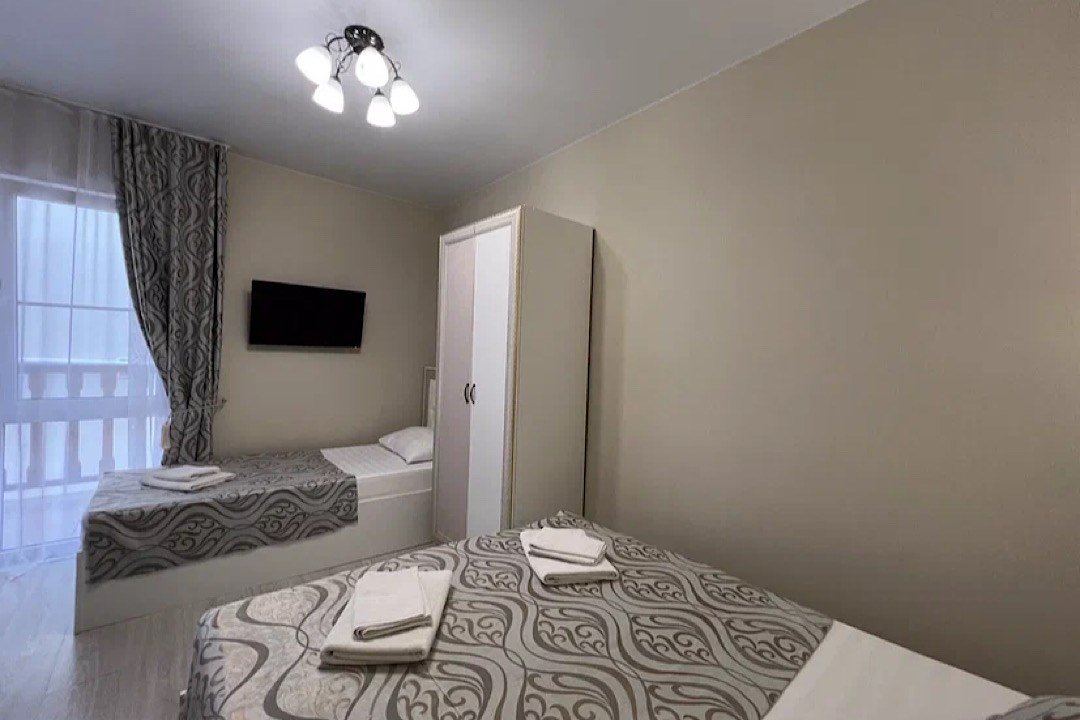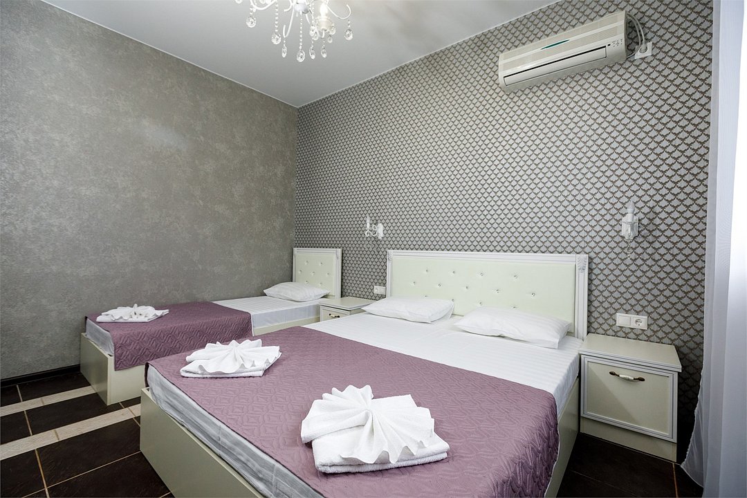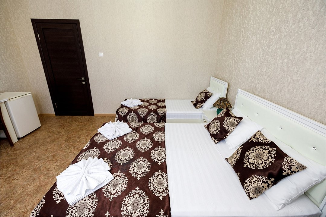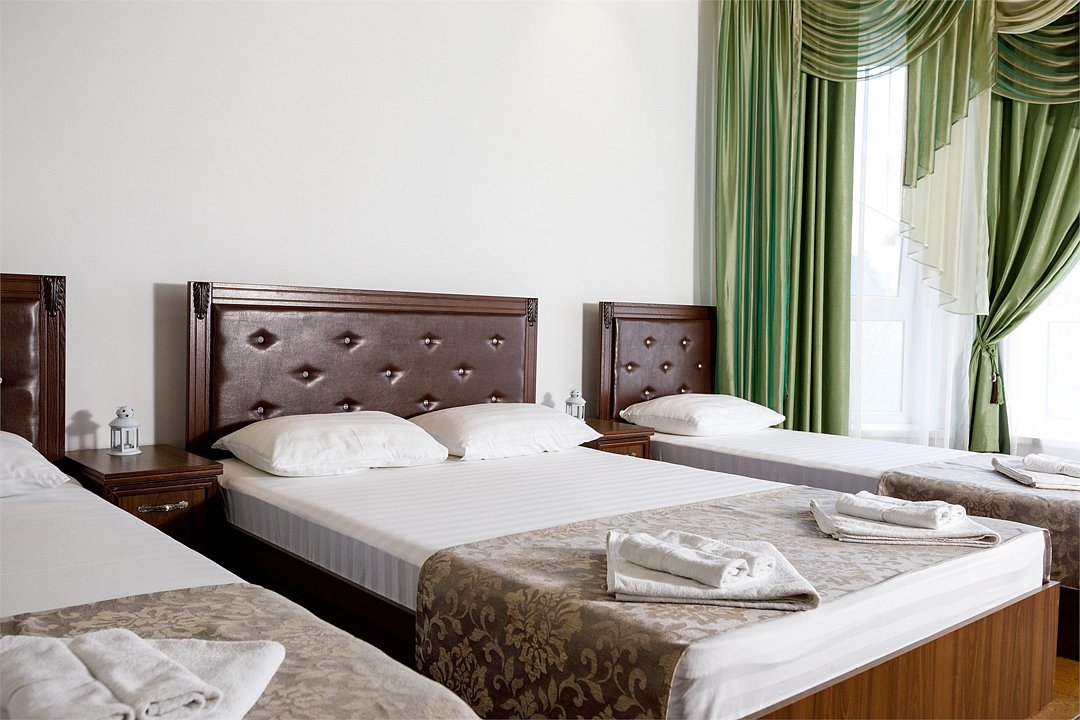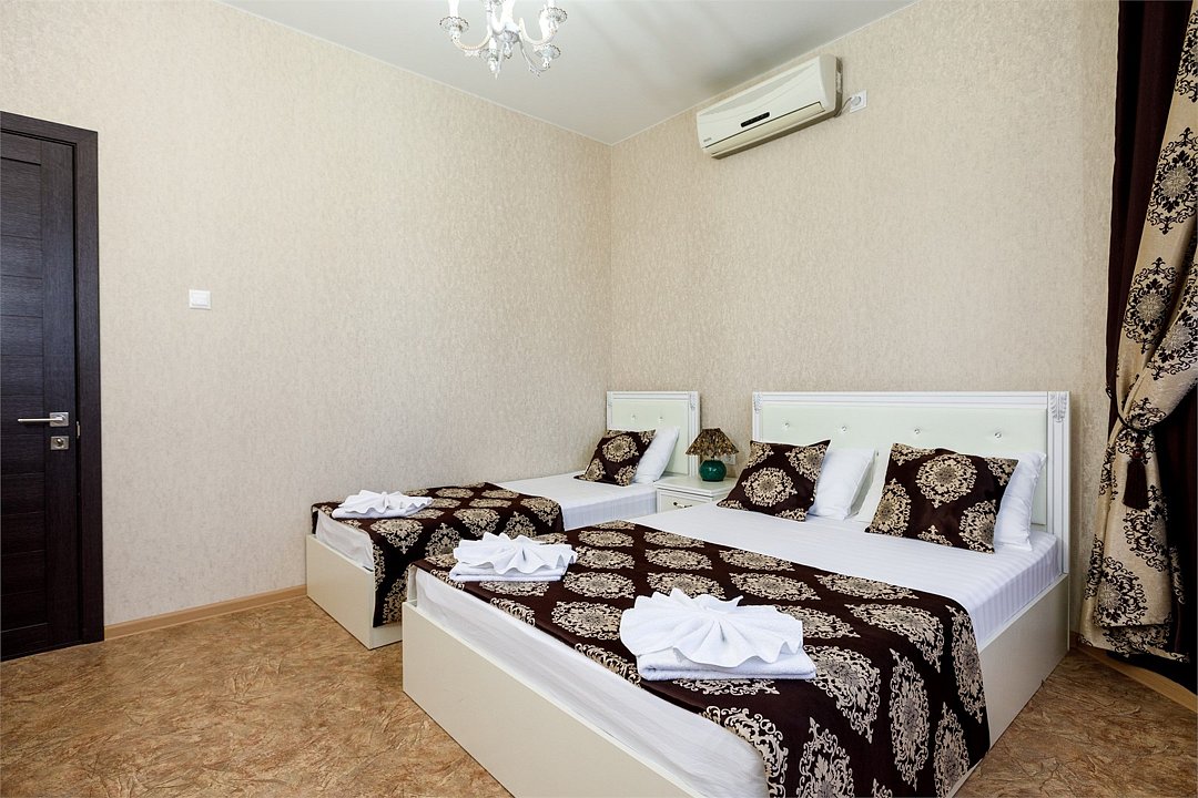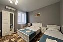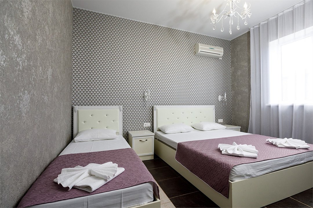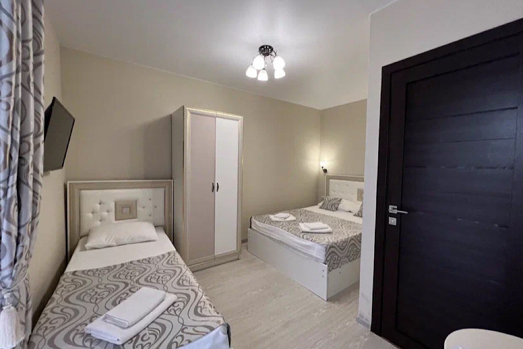 Wi-Fi, холодильник, кондиционер, фен, ванна, банные полотенца, двуспальная кровать, две односпальные кровати, шкаф для одежды, вешалки, журнальный столик, зеркало, пуфики, душ, вид во двор, тумба, туалетные средства, телевизор с плоским экраномВ номере
