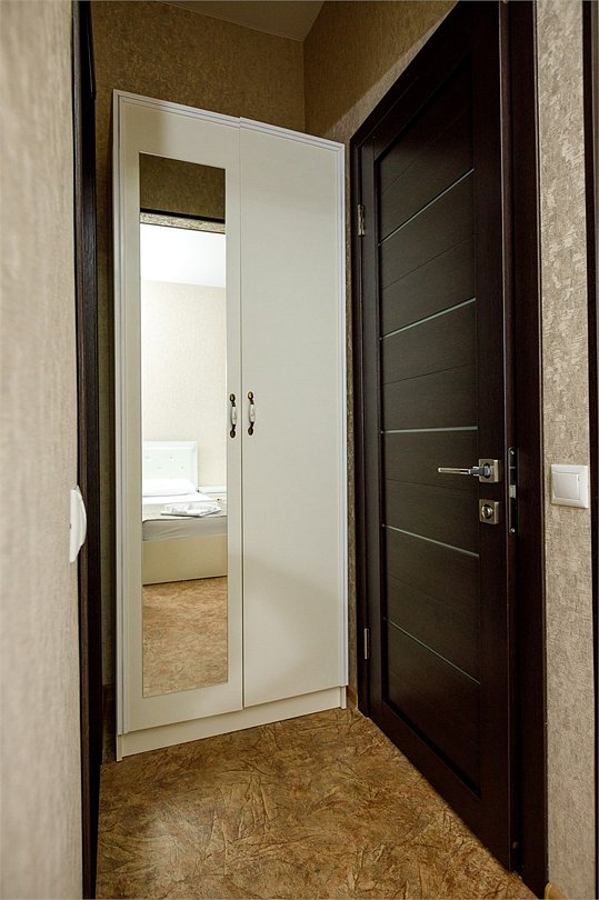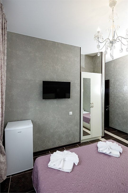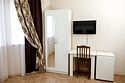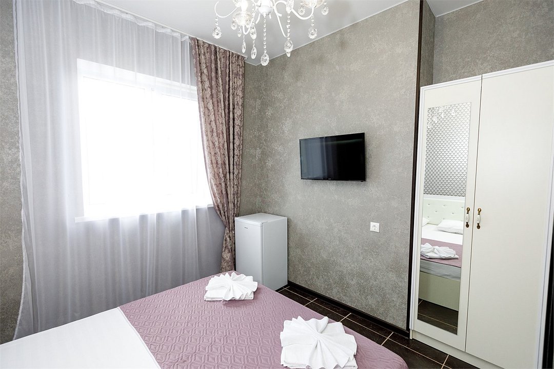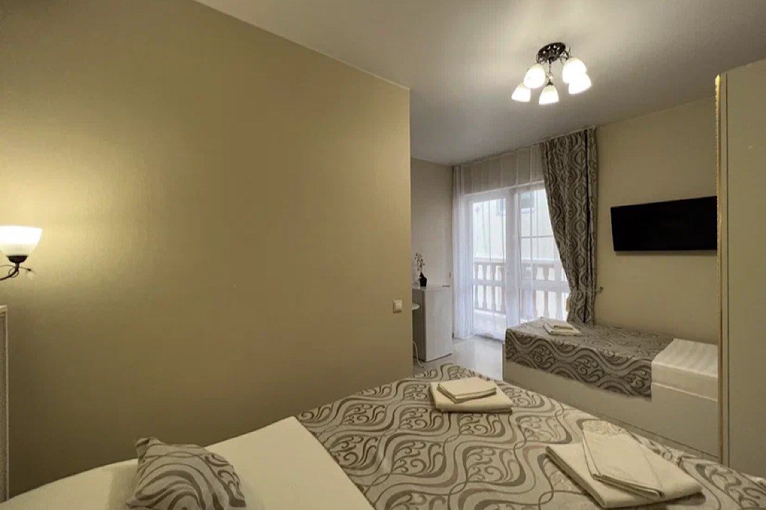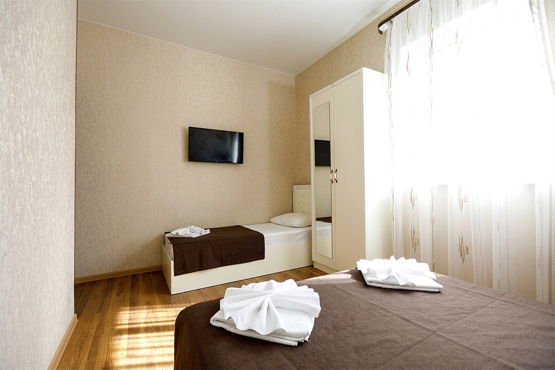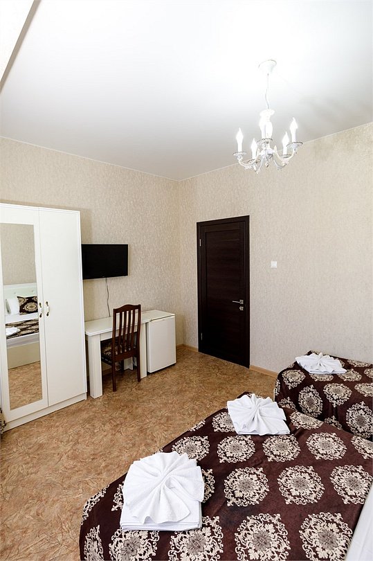 два телевизора, Wi-Fi, холодильник, кондиционер, фен, утюг, ванна, банные полотенца, две двуспальные кровати, односпальная кровать, тумбы, шкаф для одежды, вешалки, письменный стол, зеркало, обслуживание номеров, раковина, душ, вид во двор, стул, туалетные средства, туалетВ номере