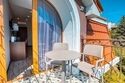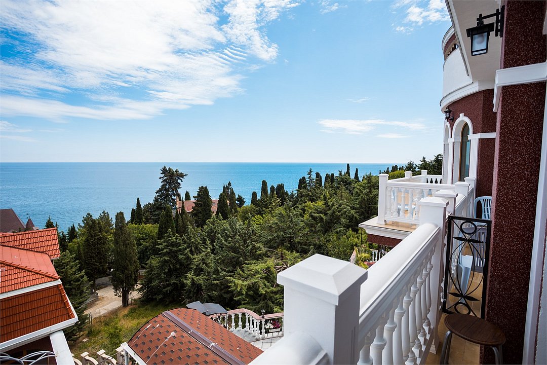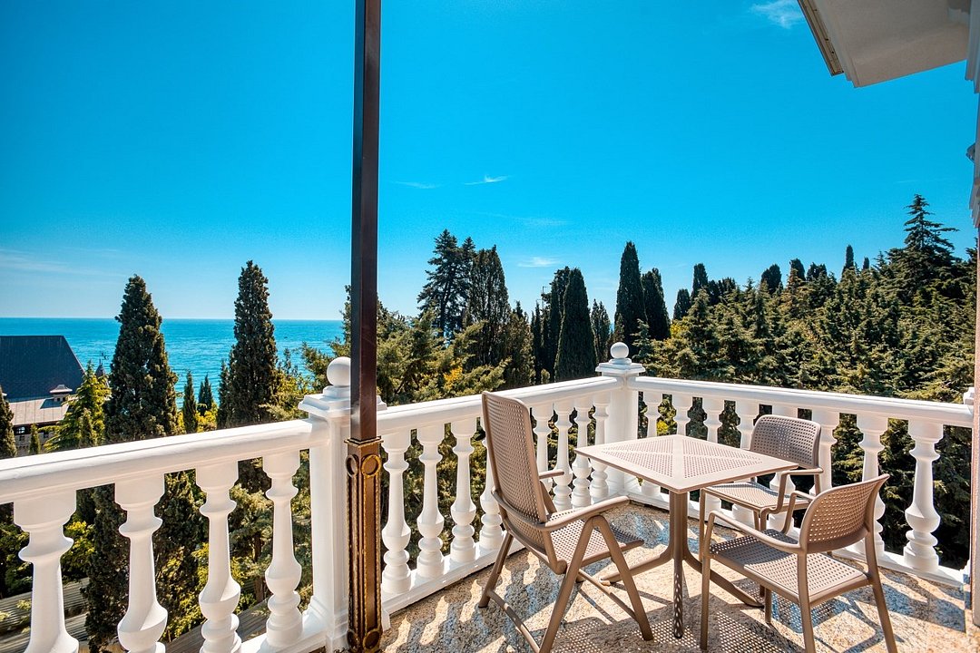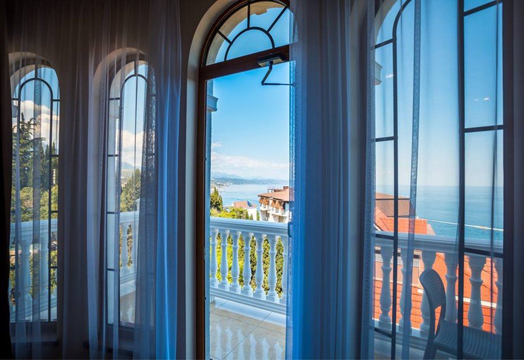 Номер с панорамным остеклением и большим балконом, с которого открывается частичный вид на море.