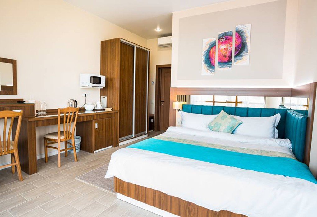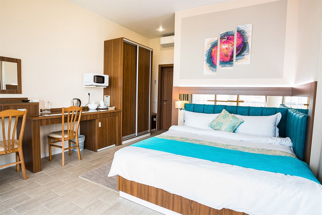 Путешествие с семьейВосторг! То место куда хочется вернутьсяЭто просто великолепное место. Мы отдыхали в студии Делюкс двухкомнатный. Все как заявлено на официальном сайте Гранатового поместья, только в два раза лучше. Шикарные ортопедические матрасы, подушки просто волшебные, номер оснащён всем начиная от посуды, заканчивая сейфом, стиральной машиной, утюгом, гладильной доской. Мы были в корпусе Б. Потрясающий вид на море и горы с балкона. Ком 202👍 Вежливый персонал, управляющий просто душевный человек.