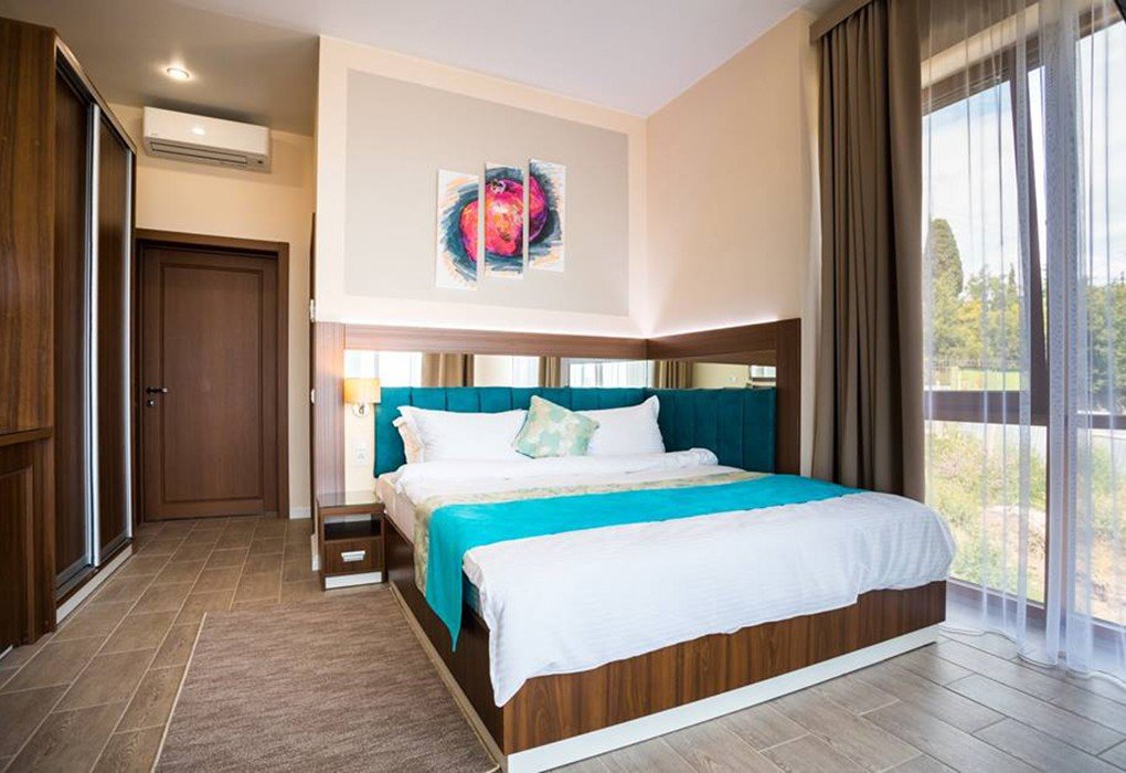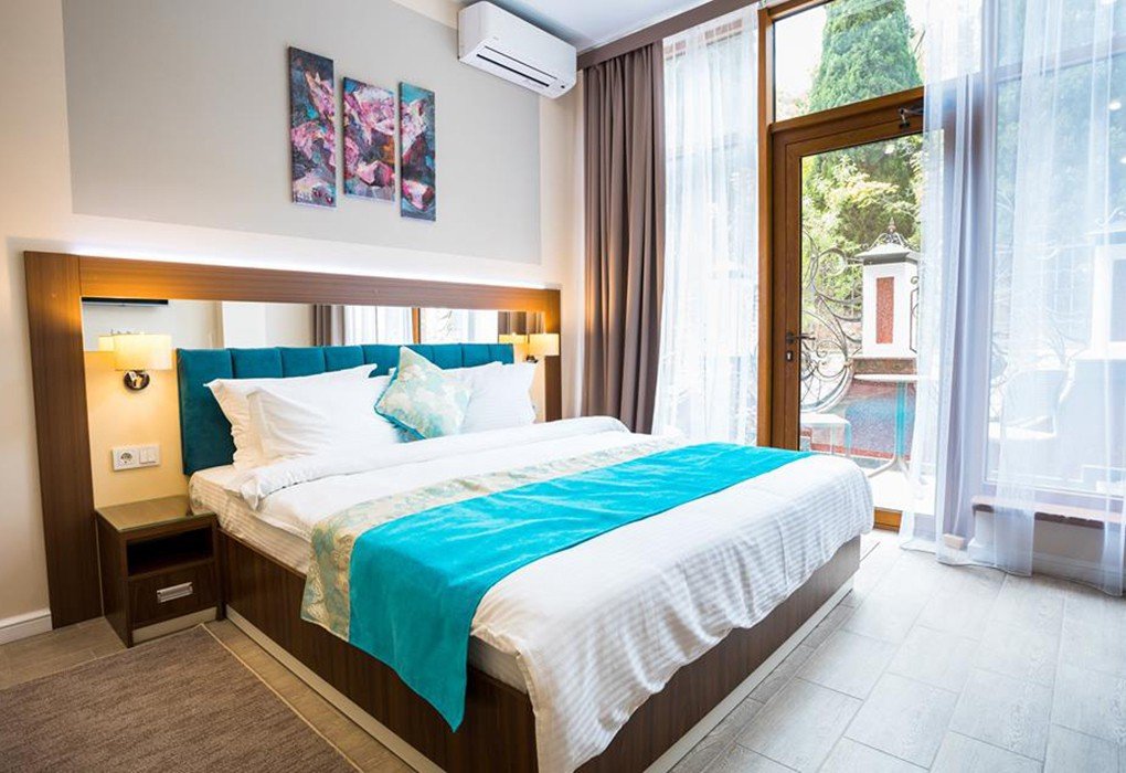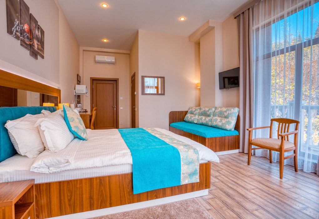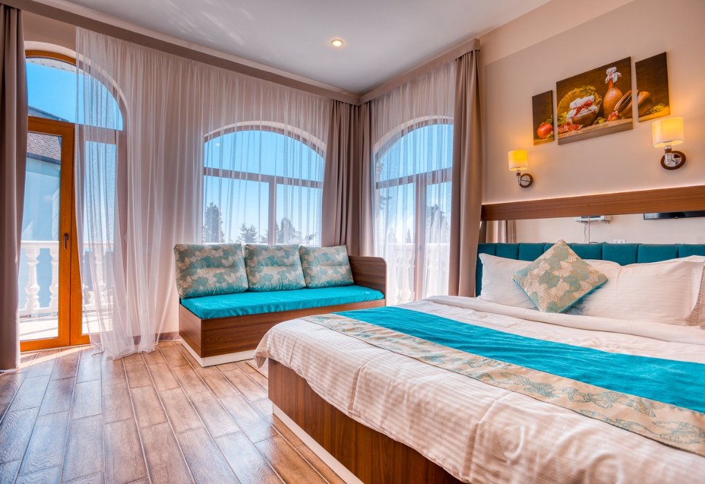 Номер с двуспальной кроватью. Панорамные окна с видом на море и горы. Без балкона.
