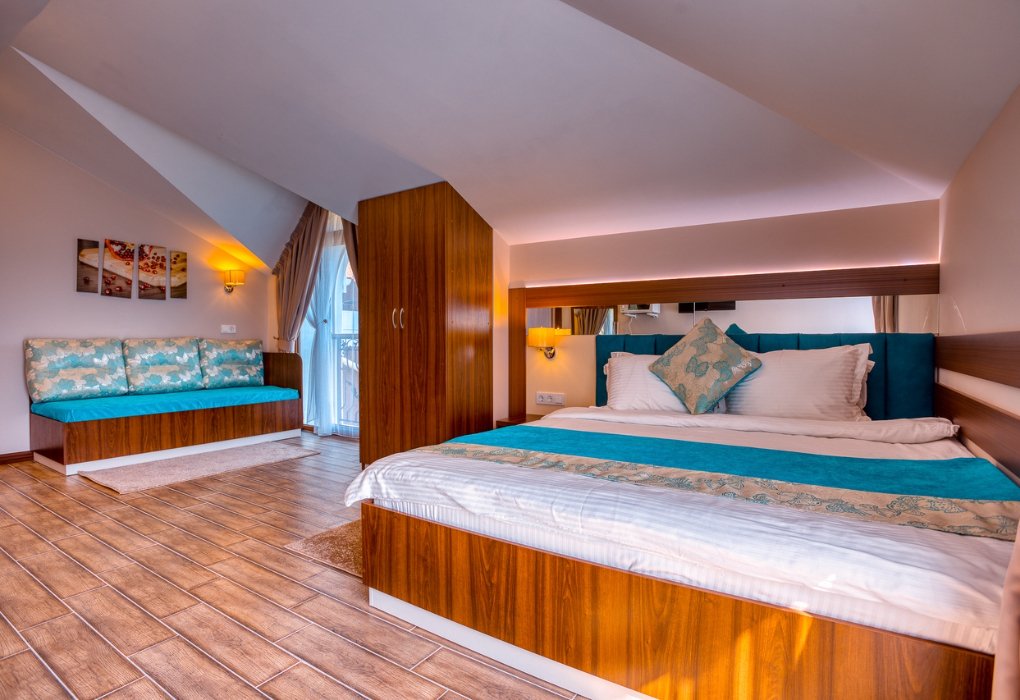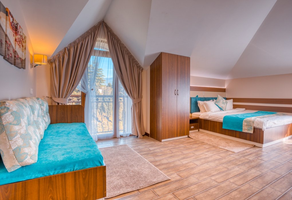 В номере 1 двуспальная кровать и 2 тахты (в которых используются полноценные ортопедические матрасы).