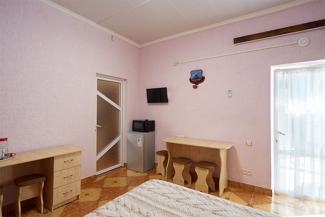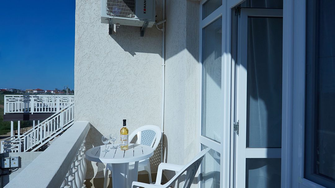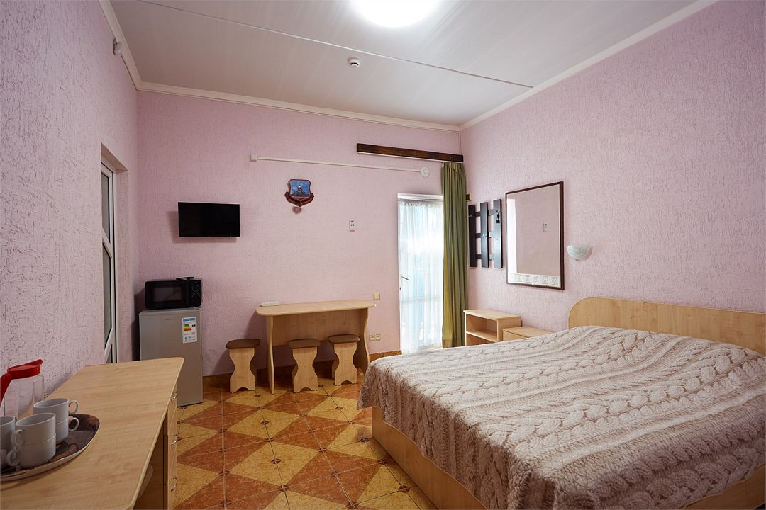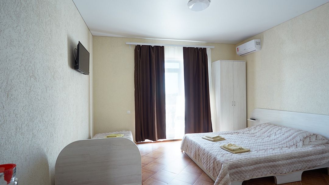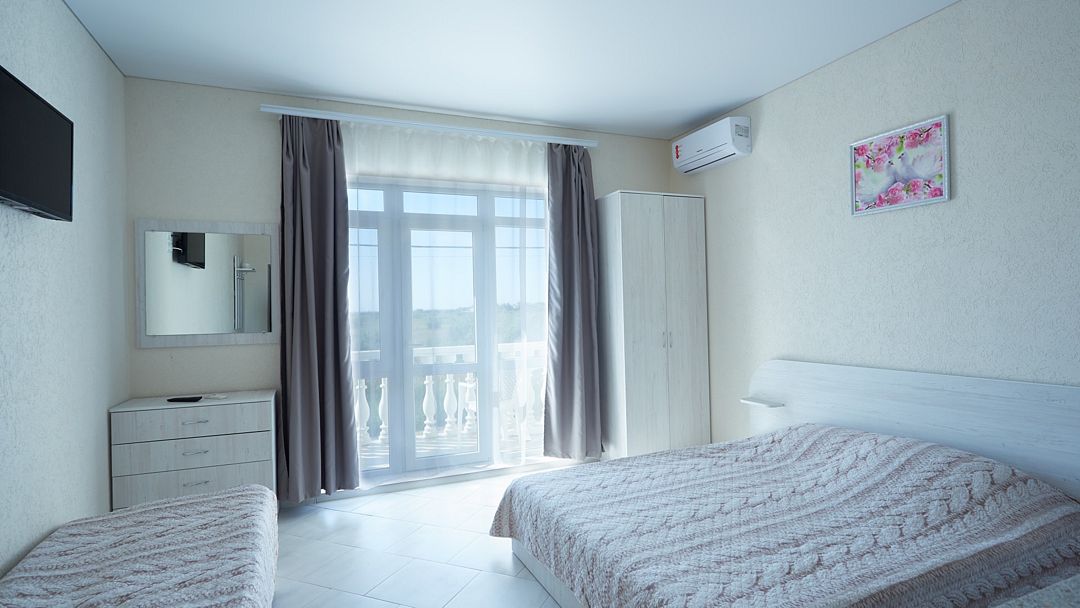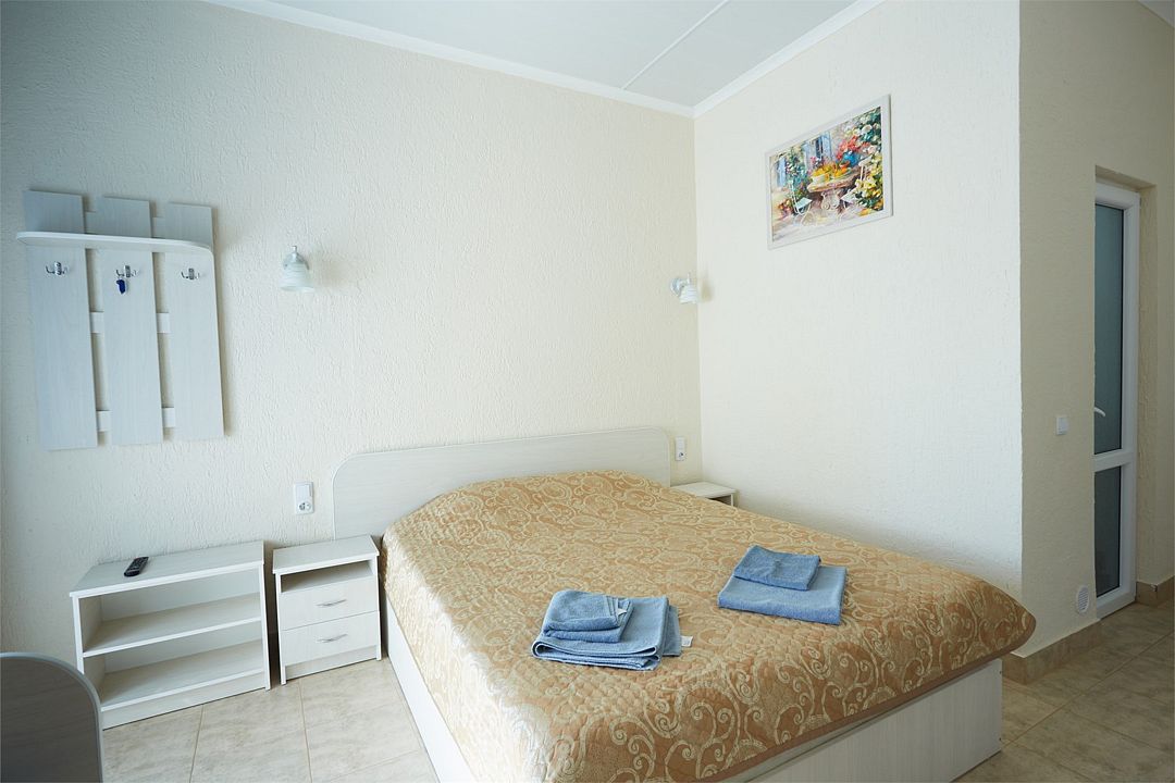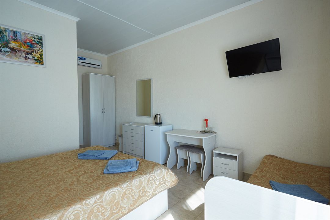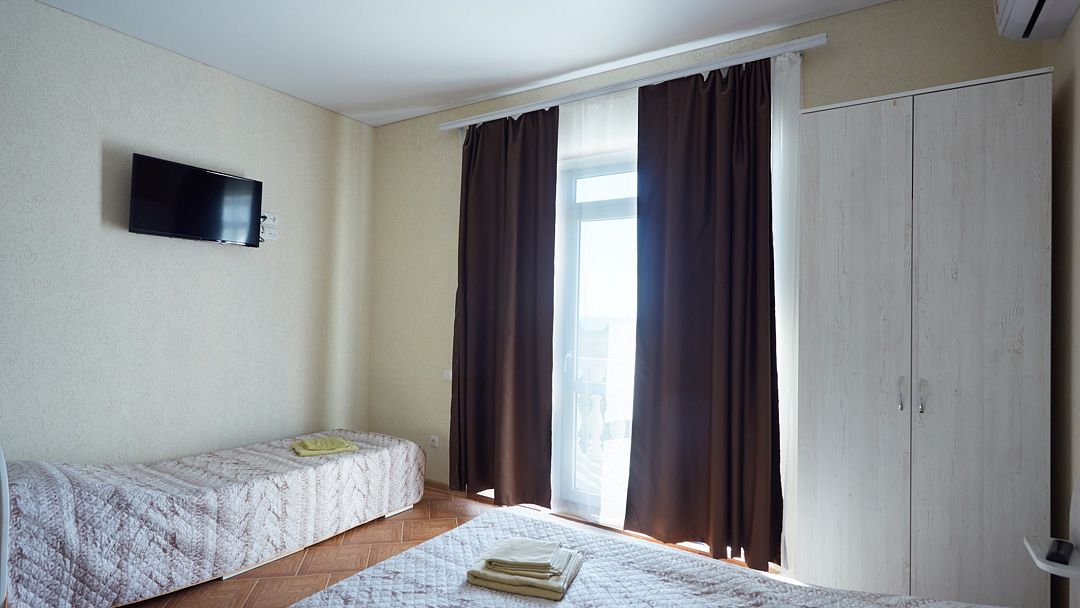 Улучшенные однокомнатные номера с видом на море оборудованы двуспальной кроватью и одной односпальной. Ремонт в номерах произведён в 2021 году, полностью обновлена мебель, в комплектацию добавлен фен, электрический чайник. Номер предназначен для проживания троих человек. Возможна установка дополнительного спального места или детской кроватки, по согласованию.Услуги и удобства