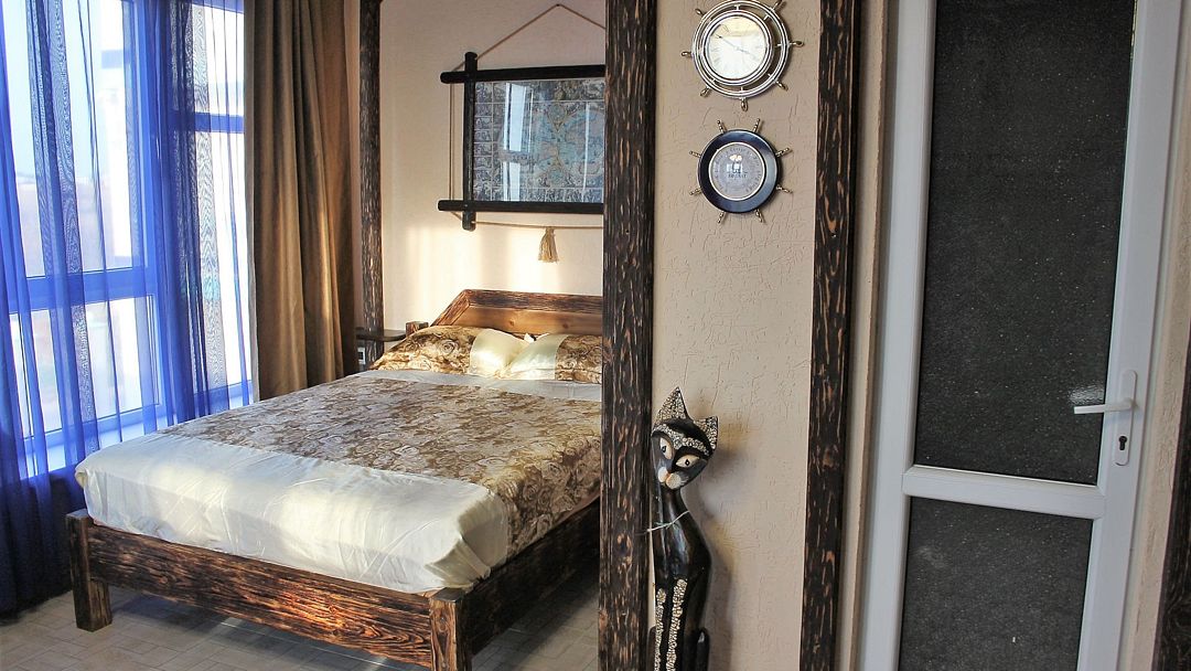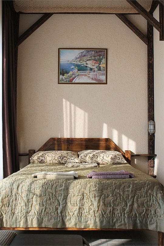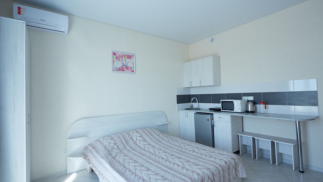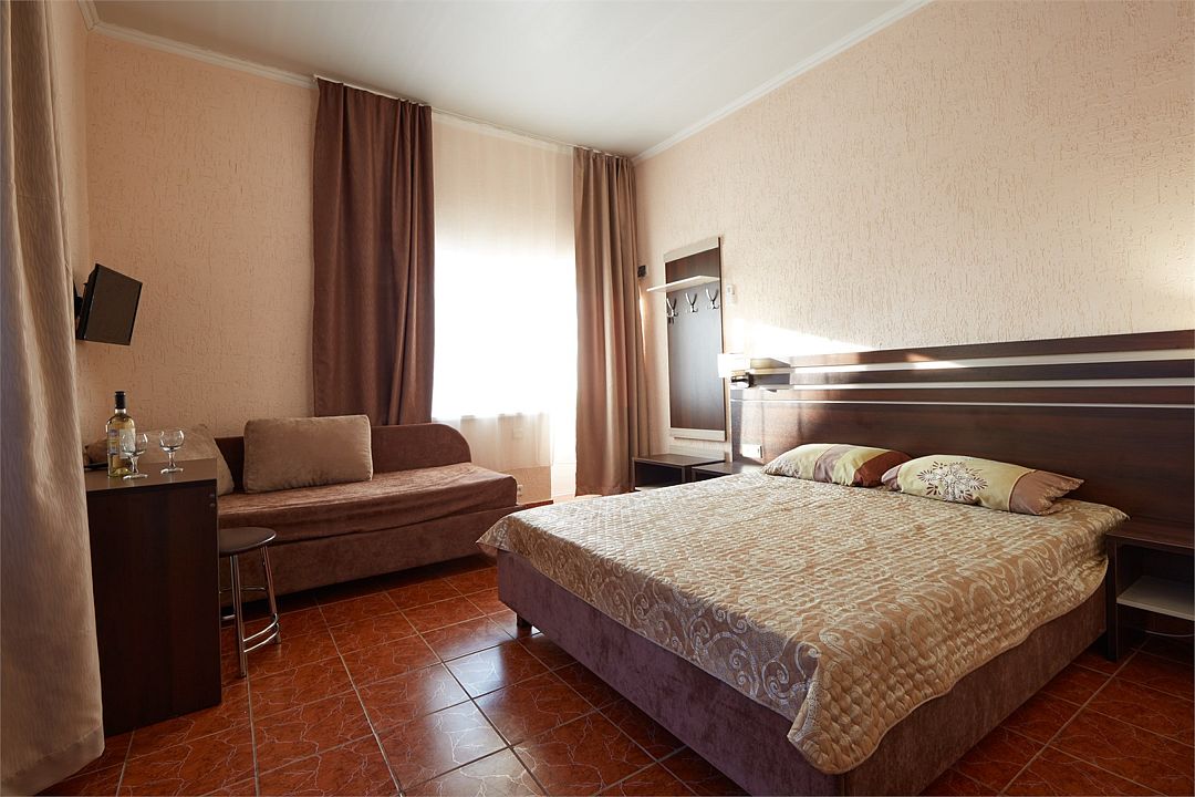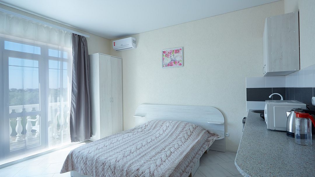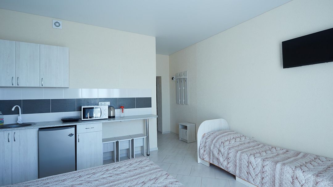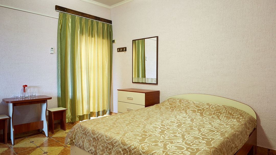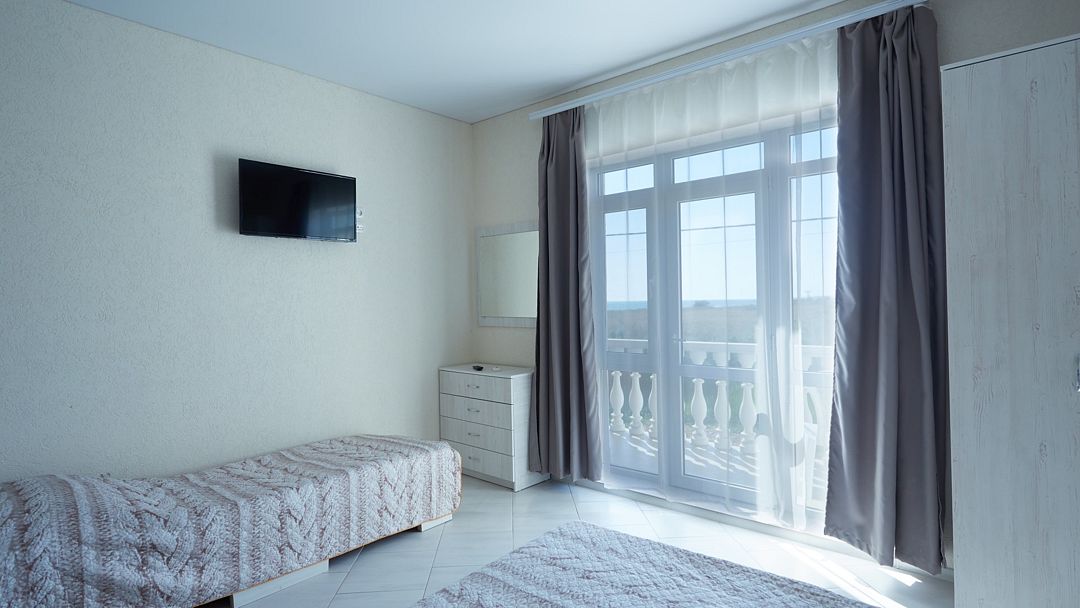 Улучшенные однокомнатные номера с видом на море оборудованы двуспальной кроватью и одной односпальной. Ремонт в номерах произведён в 2021 году, полностью обновлена мебель, в комплектацию добавлен фен, электрический чайник. Номер предназначен для проживания троих человек. Возможна установка дополнительного спального места или детской кроватки, по согласованию.Услуги и удобства