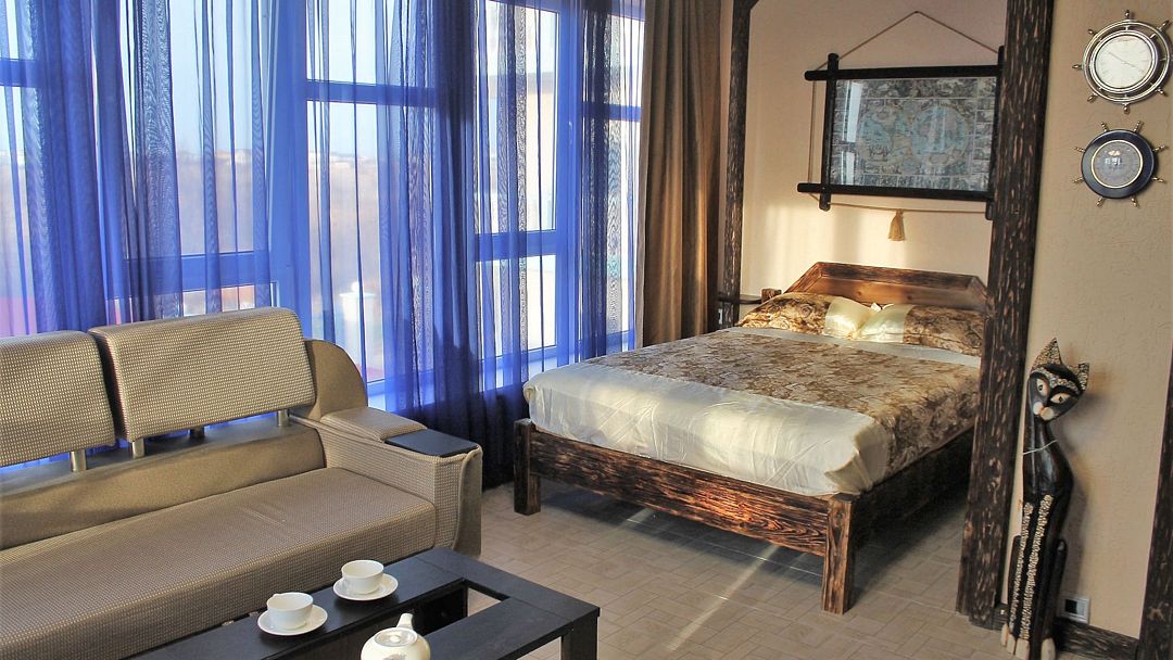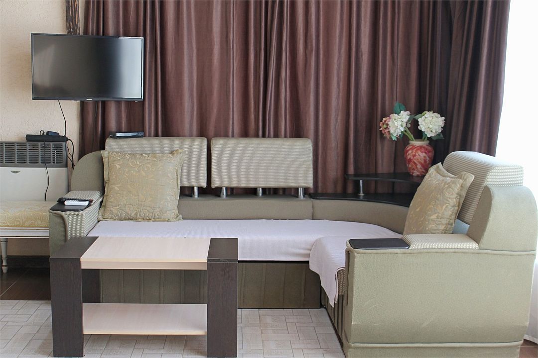 Для тех, кто оценит сочетание комфорта и природы! Идеально для молодоженов! Номер Люкс в пансионате «Ультрамарин» — это возможность любоваться солнечным закатом, не выходя из комфортабельного номера. Большие панорамные окна этого номера и просторная терраса с отличным видом на море в сочетании с уютом и комфортом обстановки сделают Ваш отдых незабываемо восхитительным! Двуспальная кровать с ортопедическим матрасом, угловой диван, кондиционер, холодильник, спутниковое телевидение, персональный минисейф, Wi-Fi – все это в Вашем распоряжении! Номер предназначен для комфортного проживания двух человек, но, при необходимости, диван раскладывается, обеспечивая еще два спальных места.Услуги и удобства