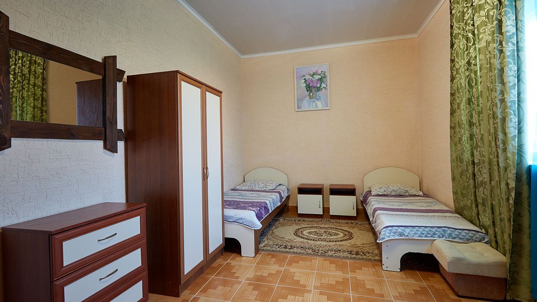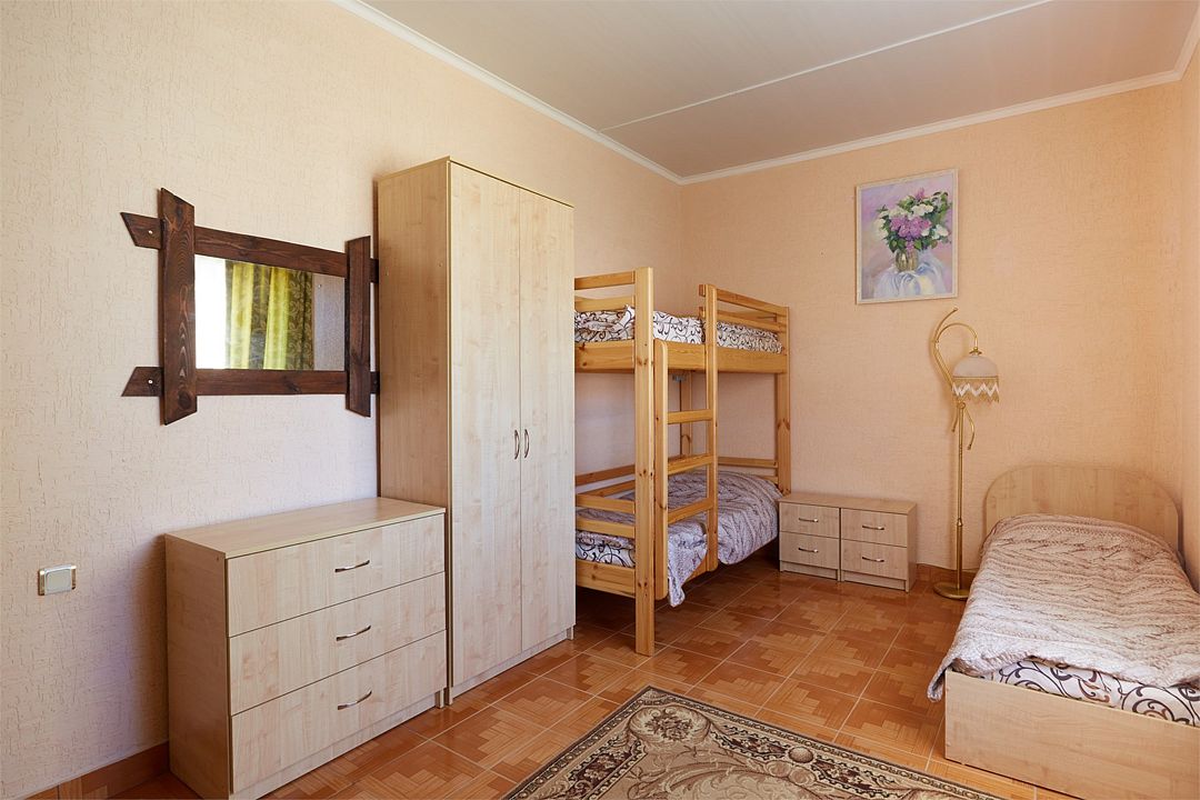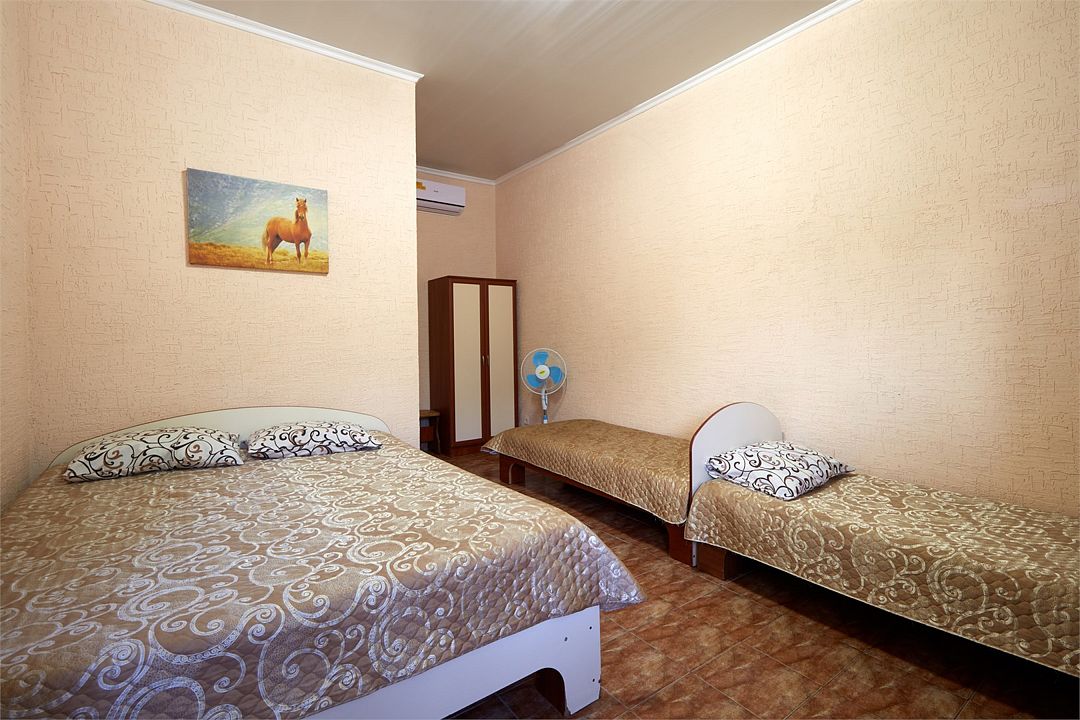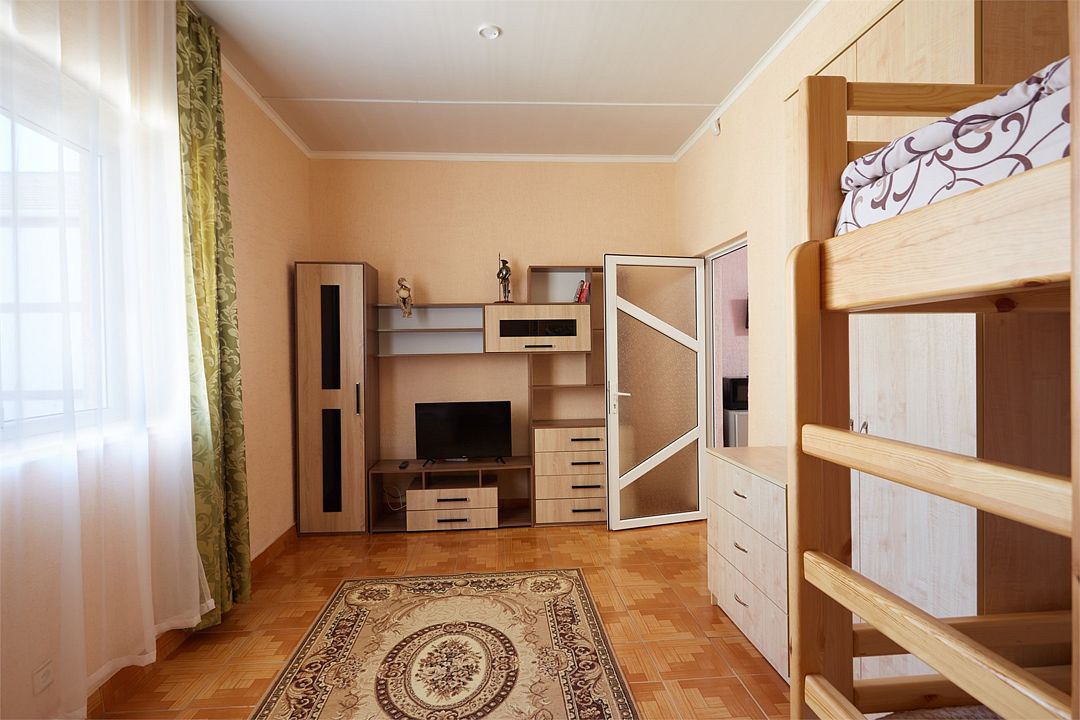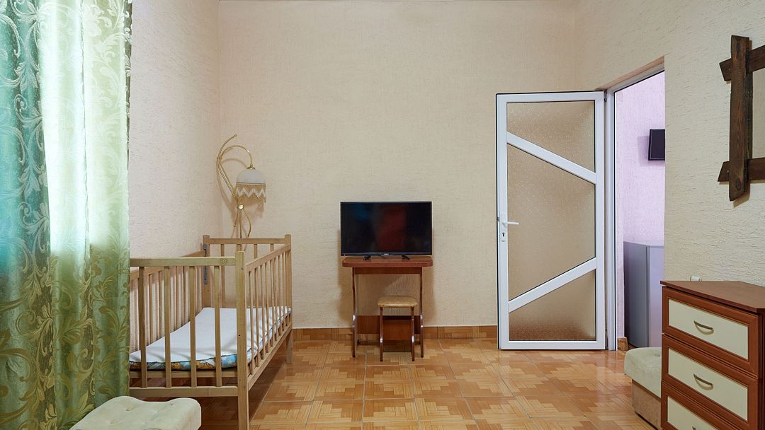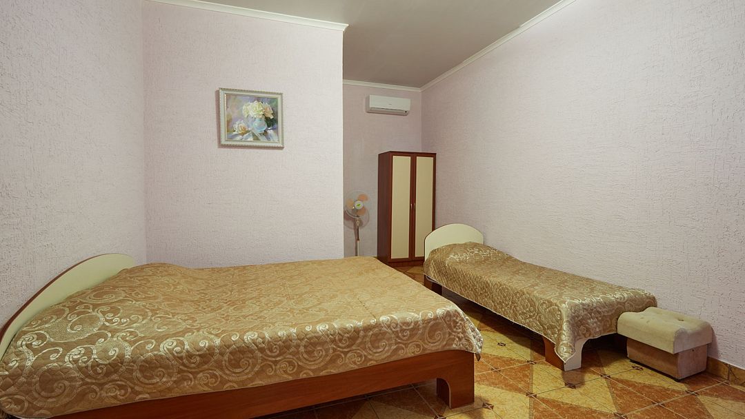 Двухкомнатный семейный номер с кондиционером идеально подходит для большой семьи или компании. Большая двуспальная кровать, двухъярусная кровать и односпальная кровать. Телевизор, холодильник, санузел с душевой кабиной, WI-FI, кондиционер. В проходной "родительской" комнате освещение организовано за счёт стеклянной входной двери, выходящей на южную балюстраду, в детской - окно во двор. То что нужно родителям, которые не спешат отойти ко сну после того, как уложат детей! Звездной крымской ночью можно прогуляться по пустынному пляжу или отдохнуть в нашем баре за бокалом вина. И можно не опасаться, по возвращении, потревожить сон юных спутников. Номер предназначен для проживания пятерых человек. Детская кроватка устанавливается по предварительному запросу, так же возможна установка дополнительного спального места.Услуги и удобства