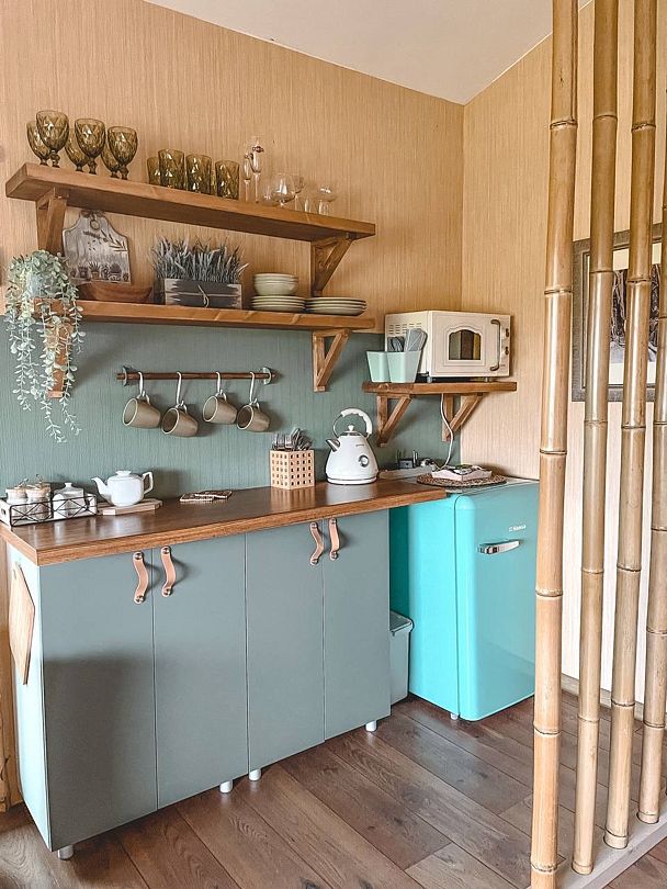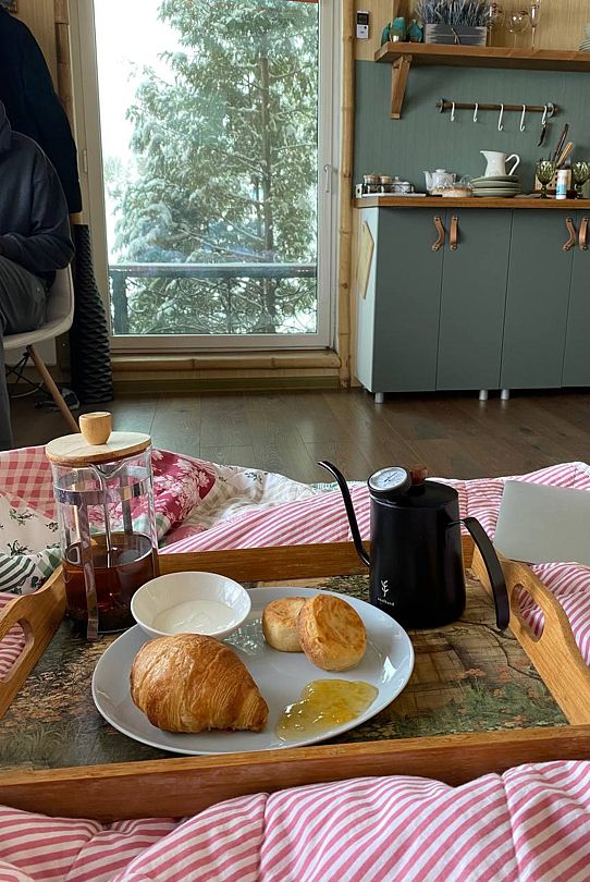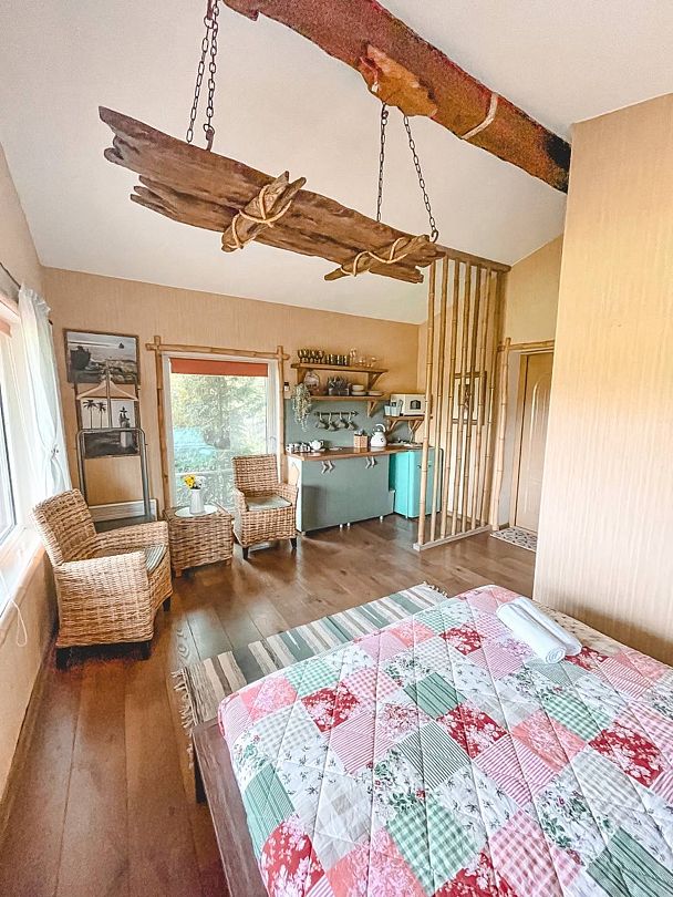 В домике есть всё необходимое для комфортного проживания: большая кровать и уютная кухня, где можно приготовить свои любимые блюда.