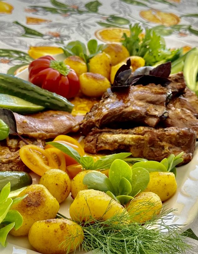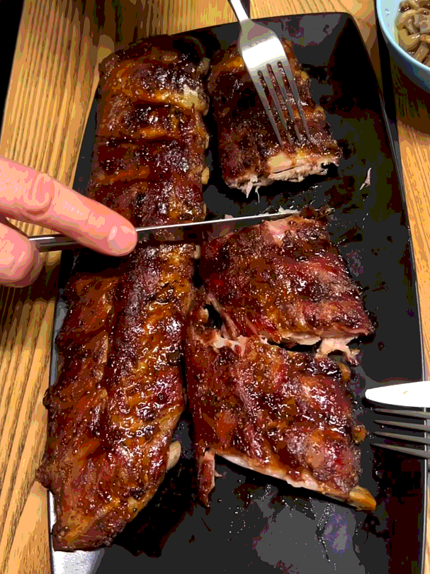 Вам могут приготовить фирменное блюдо — свиные рёбрышки в соусе «чёрный перец», с жареной картошкой, специями и сезонными овощами.