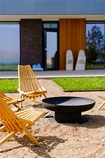 Двухкомнатный домик — двуспальная кровать в отдельной комнате, большой раскладной диван в другой комнате, два санузла. Полноценная кухня, два телевизора, камин, терраса и своя мангальная зона. Панорамные окна в пол с видом на озеро, теплые полы и вся необходимая посуда.