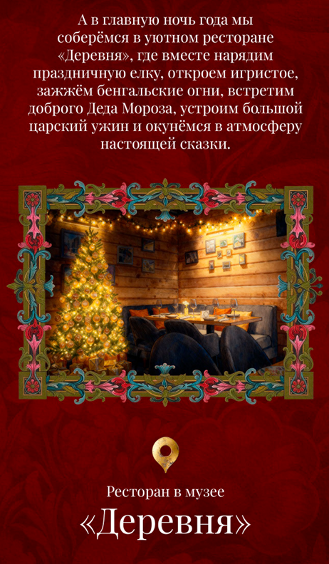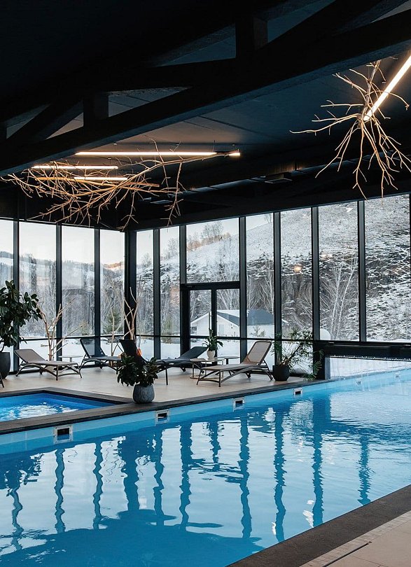 На территории – русская баня на дровах с террасой, BBQ-зоной и услугой парения. Ценители русской кухни и локальных специалитетов по достоинству оценят ресторан-музей «Деревня», работающий по концепции «from farm to table». В меню – фермерские продукты, блюда из марала, муксуна и хариуса, щи и другие блюда русской кухни из натуральных ингредиентов.