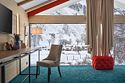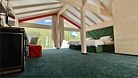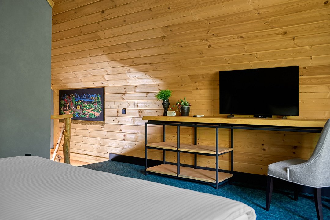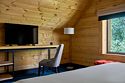 В номере располагается большая двуспальная кровать, ТВ, письменный стол. Все удобства в номере. Панорамные окна позволят наблюдать за величием гор в любое время суток Вашего отдыха.