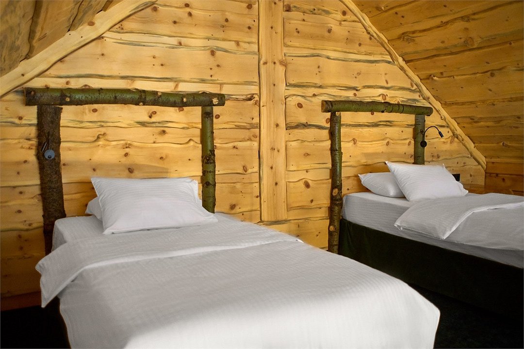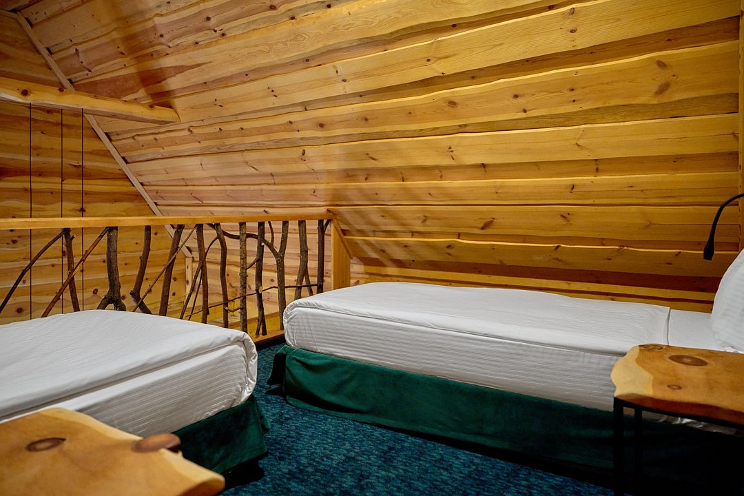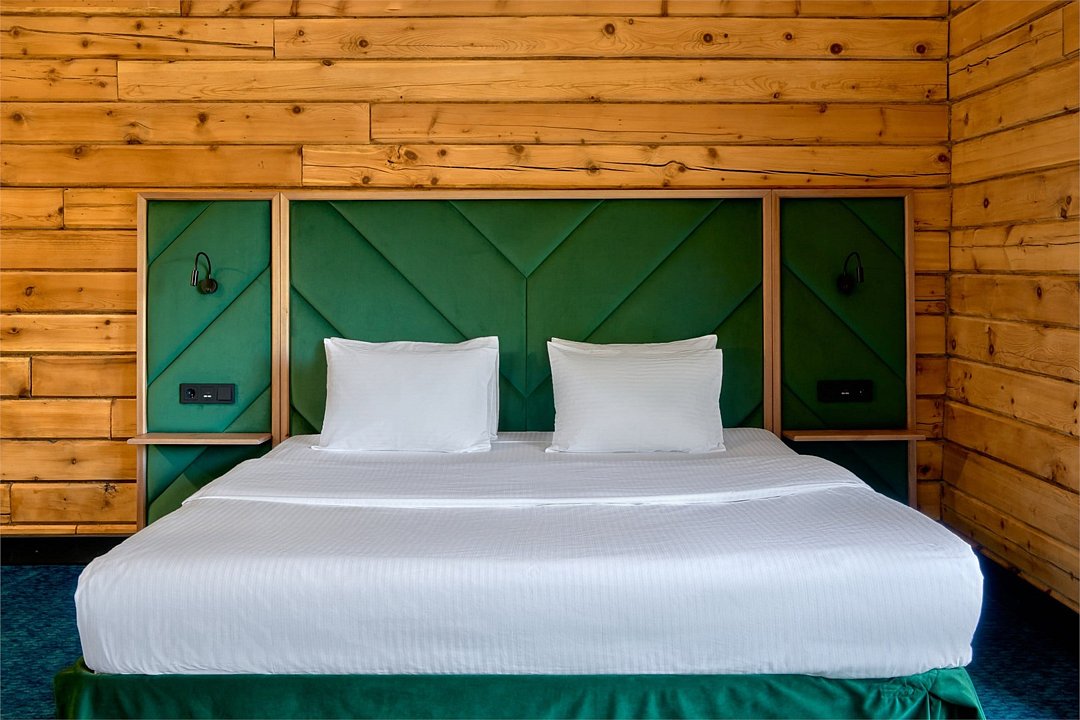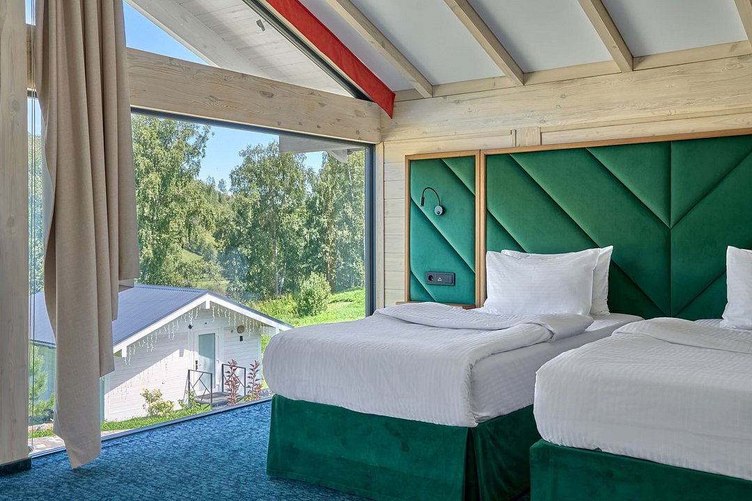 Комфортные кровати, ТВ, письменный стол. Все удобства в номере. Панорамные окна позволят наблюдать за величием гор в любое время суток Вашего отдыха.
