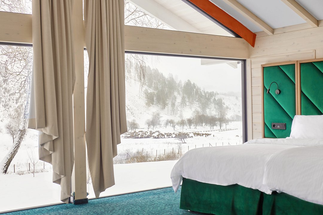 Приятный бонус банного комплекса Altai Palace — это наличие шикарных панорамных окон с видами на природу Алтая.