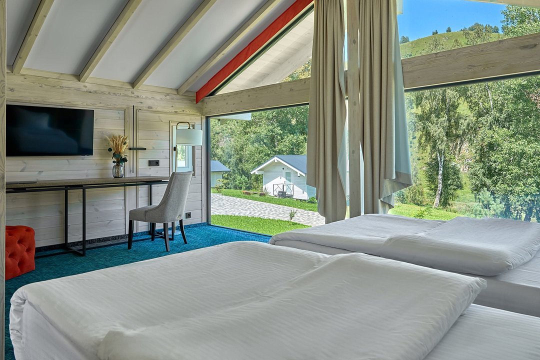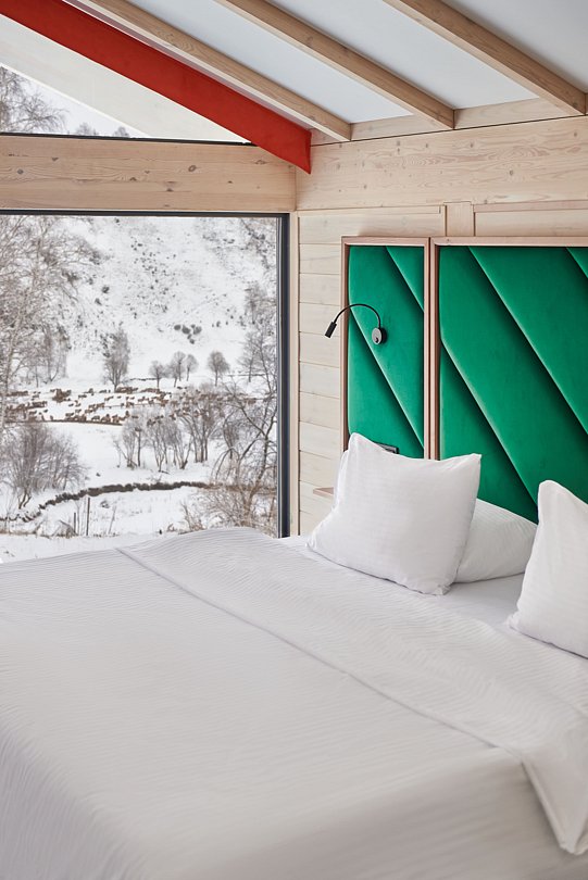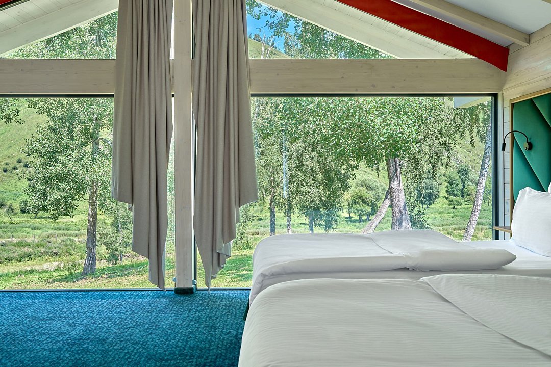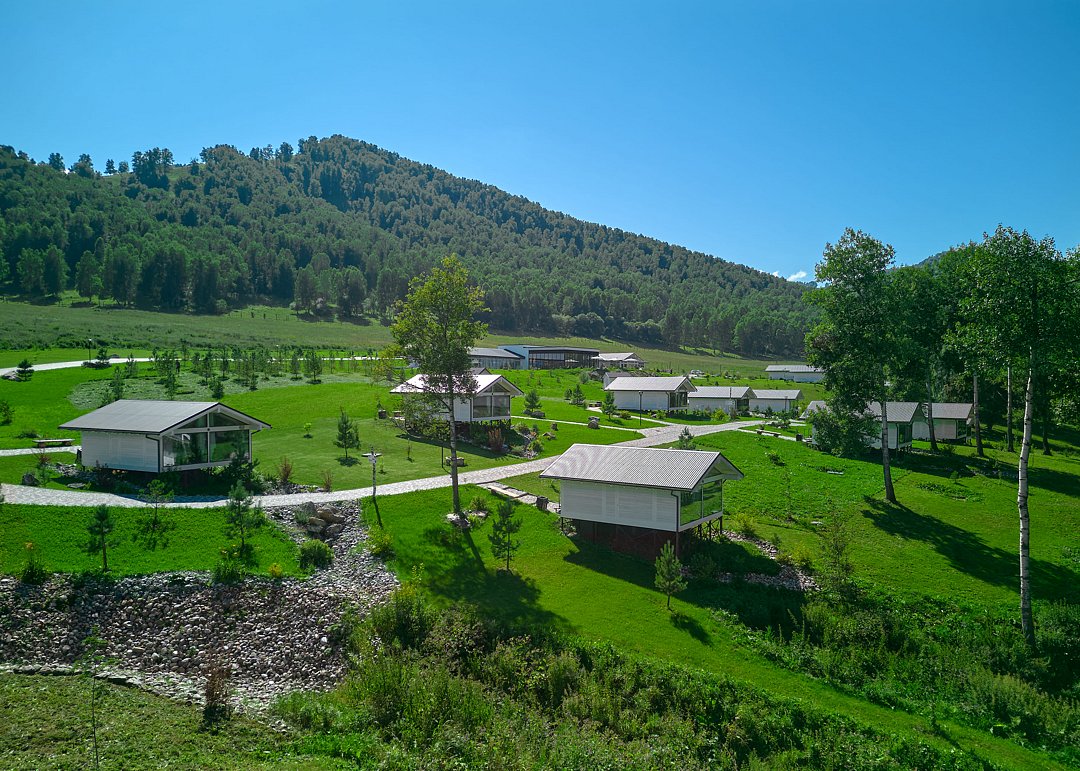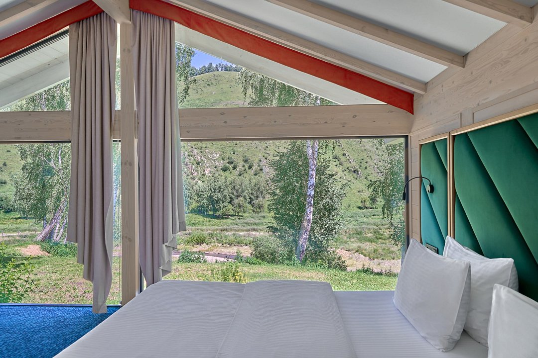 Гостям доступны 26 современных шале от 35 до 90 кв.м., включая виллу-апартаменты с собственным бассейном. Все дома оснащены панорамными окнами с видом на парк маралов у подножия горы Каим. Гостям предоставляется услуга персонального батлера, который будет на связи в круглосуточном режиме и выполнит любые просьбы.