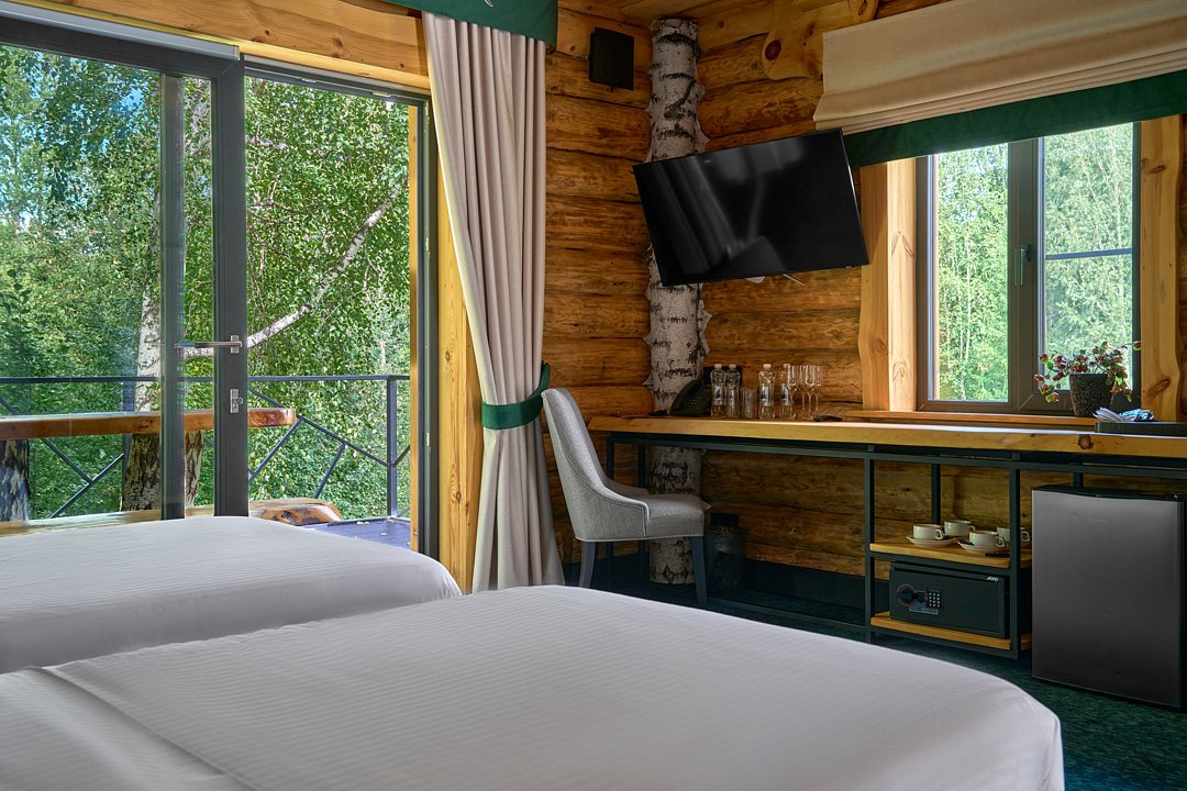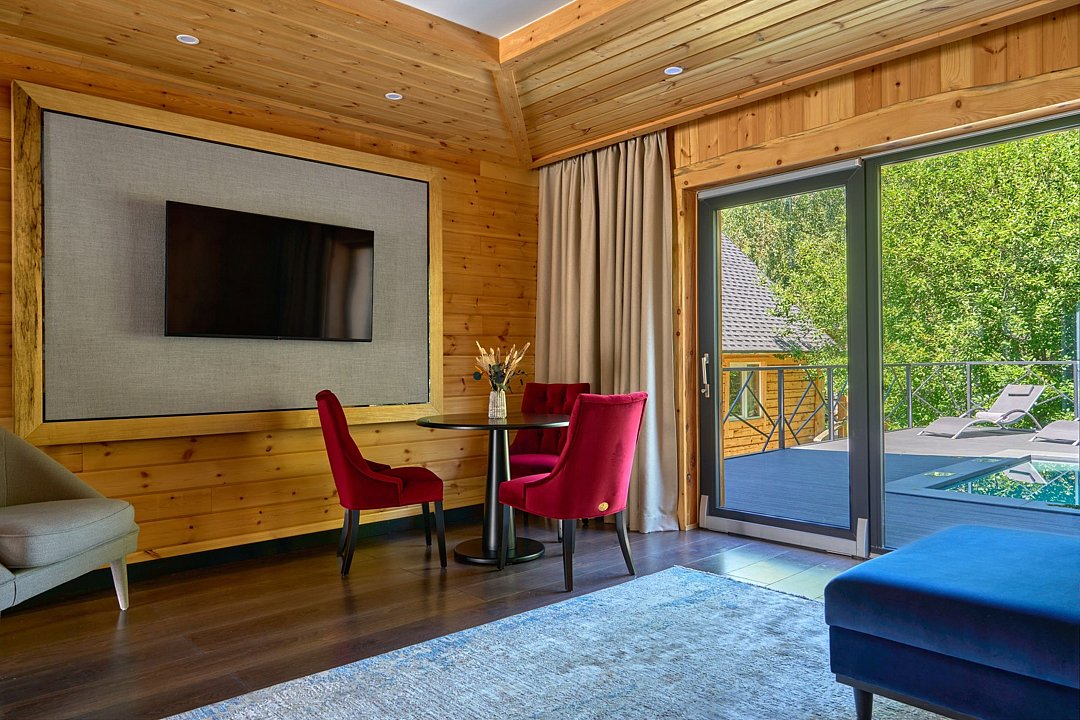 Просторная двухэтажная вилла люкс из массива натурального дерева с большим панорамным окном, выходом на собственную террасу и видом на лес. Интерьер выполнен в классическом стиле с элементами лофта. Дом оснащен всем необходимым для комфортного проживания семьи или компании друзей: две спальни с одной двуспальной и двумя односпальными кроватями с ортопедическими матрасами, мягким белоснежным бельем, кондиционером, Smart TV, блэкаут шторами, чайно-кофейной зоной и функциональной ванной комнатой. Всем гостям предоставляется услуга персонального батлера, который будет на связи в круглосуточном режиме и выполнит любые просьбы.