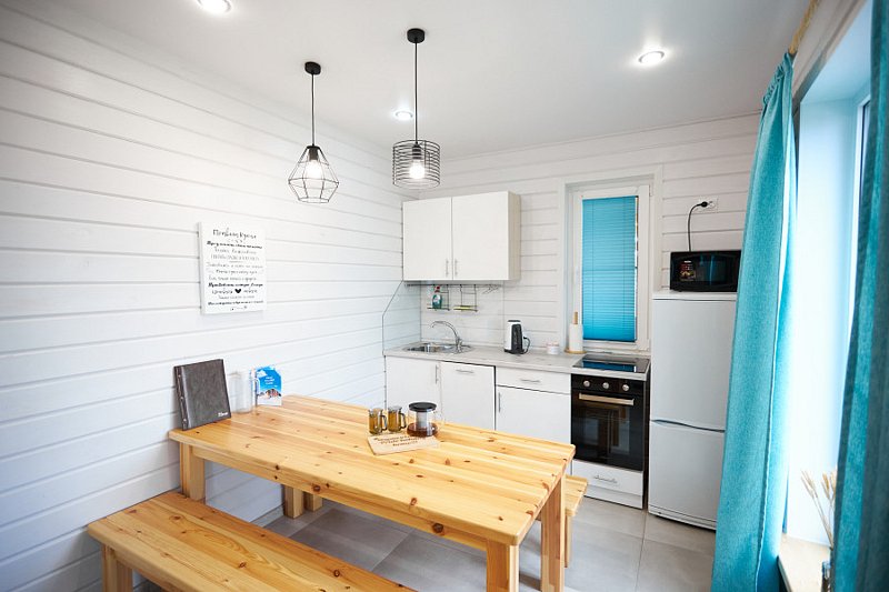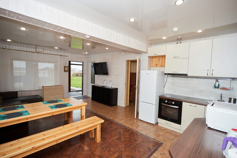 На 1 этаже располагается: гостиная (большой стол с 2 скамьями, 2 кресла-мешка, диван, телевизор), совмещённая с кухней; санузел; баня на дровах и душевая. Кухня полностью оснащена необходимой техникой для приготовления пищи (варочная поверхность, холодильник, микроволновая печь, чайник).