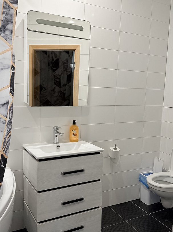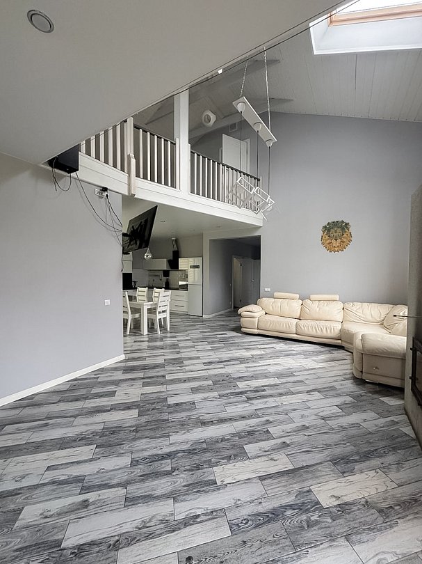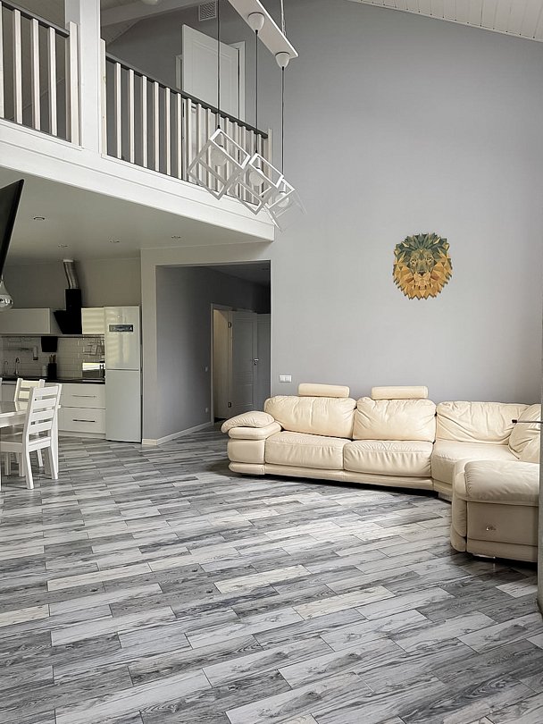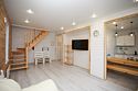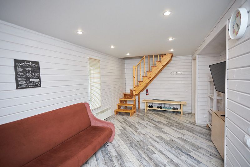 На 1 этаже располагается: уютная гостиная (с большим раскладным диваном), совмещённая с кухней и большим Smart TV; санузел, совмещённый с электрической сауной.