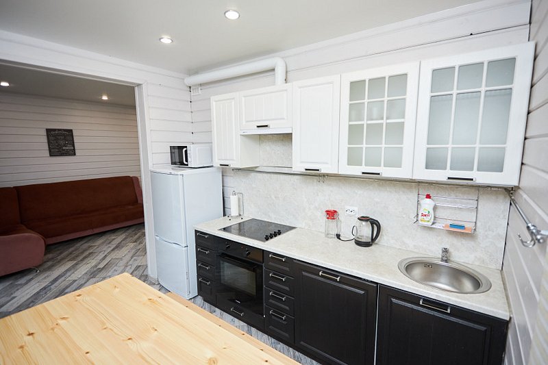 Кухня полностью оснащена необходимой техникой для приготовления пищи (варочная поверхность, холодильник, микроволновая печь, чайник).