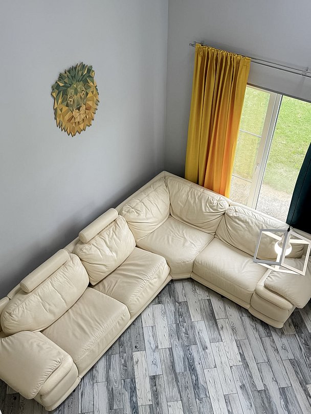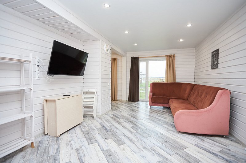 Уютная гостиная (с раскладным 2-х спальным диваном) с телевизором, совмещённая с кухней; санузел.