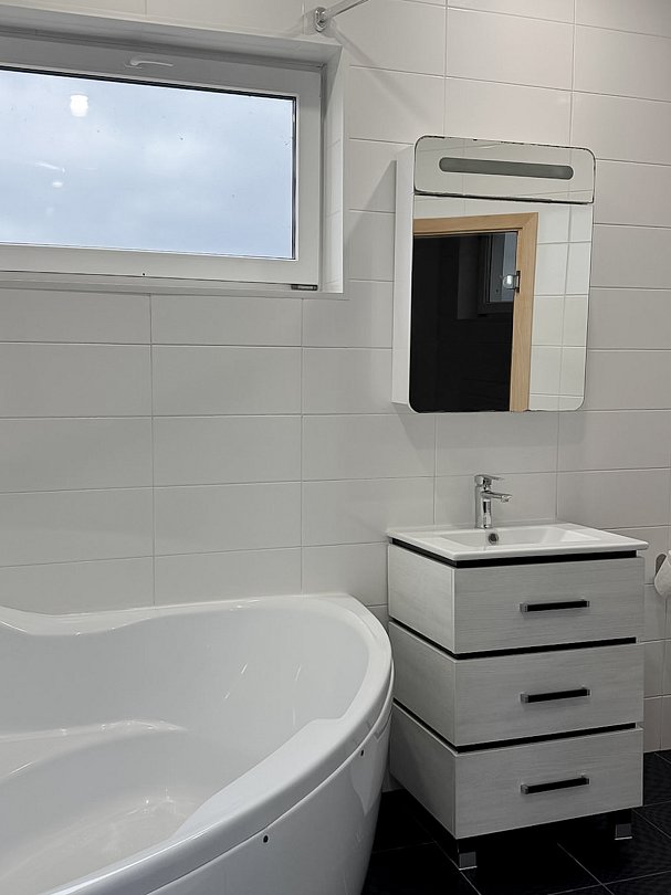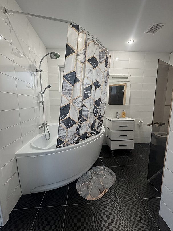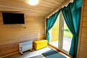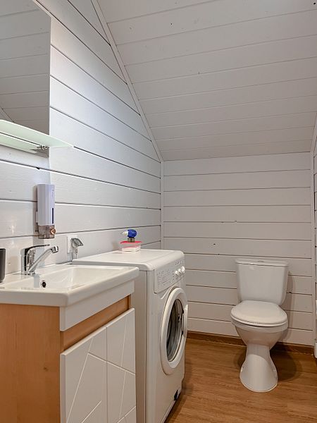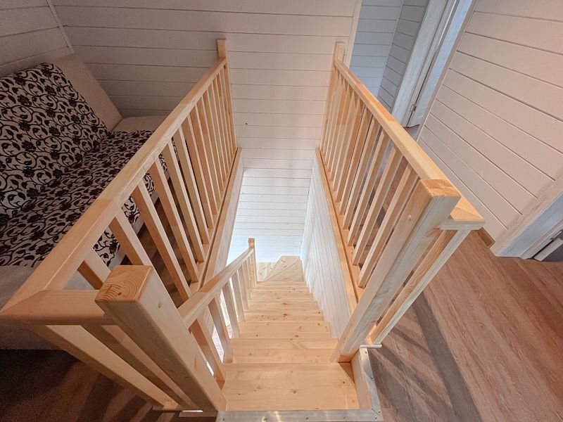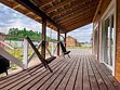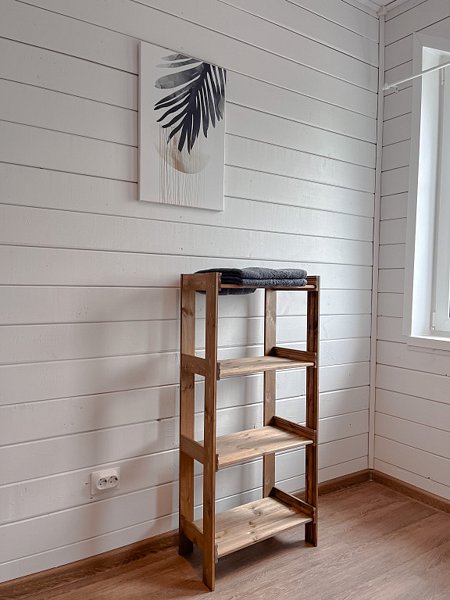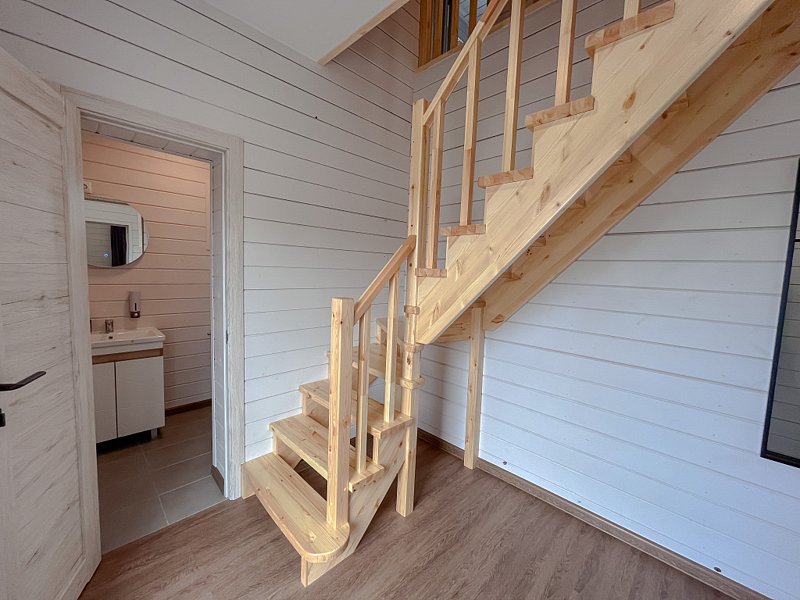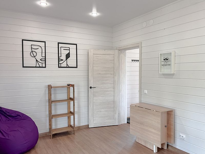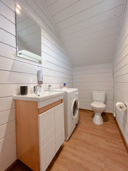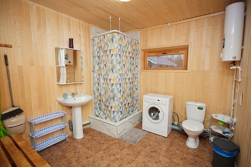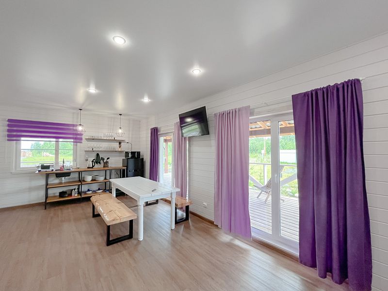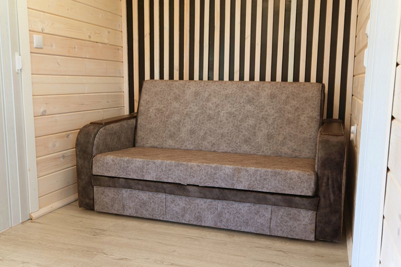 На 1 этаже располагается: большая застеклённая веранда; уютная гостиная, совмещённая с кухней (3-х местный раскладной диван); баня и место для отдыха, совмещённое через перегородку с санузлом.