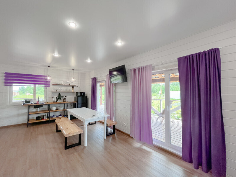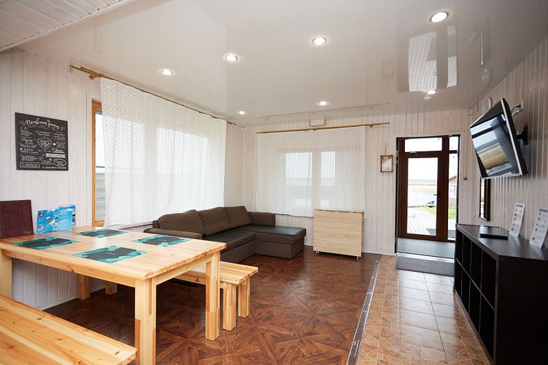 На 1 этаже располагается: гостиная (большой стол с 2 скамьями, 2 кресла-мешка, диван, телевизор), совмещённая с кухней; санузел; баня на дровах и душевая.