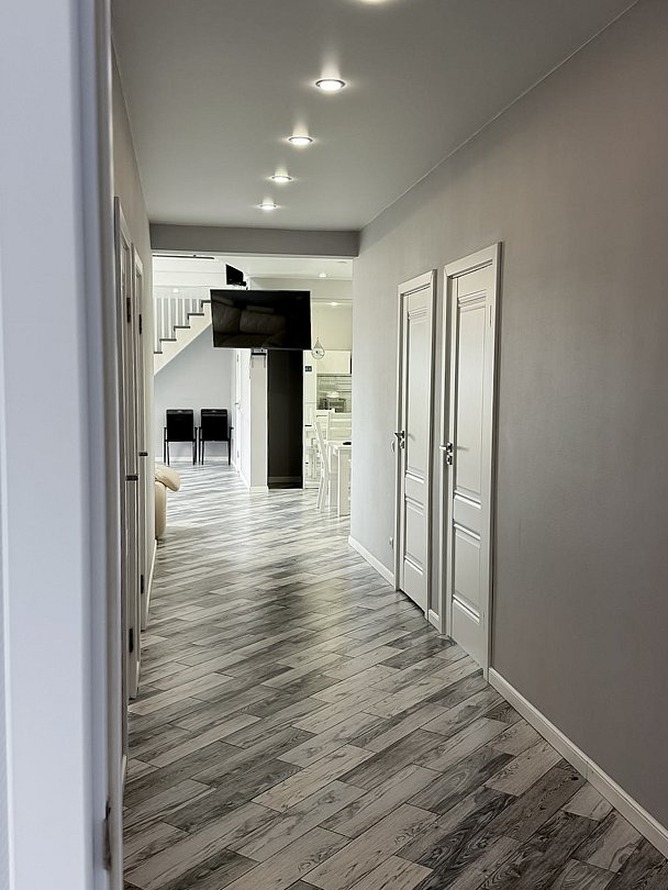 На 2 этаже: три изолированные спальни, в каждой спальне 2-х спальная кровать. Между спальнями располагается раскладной 2-х спальный диван.