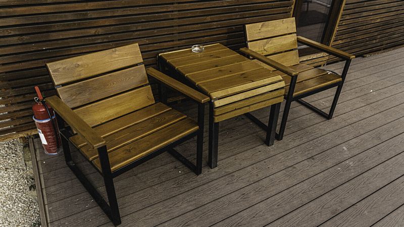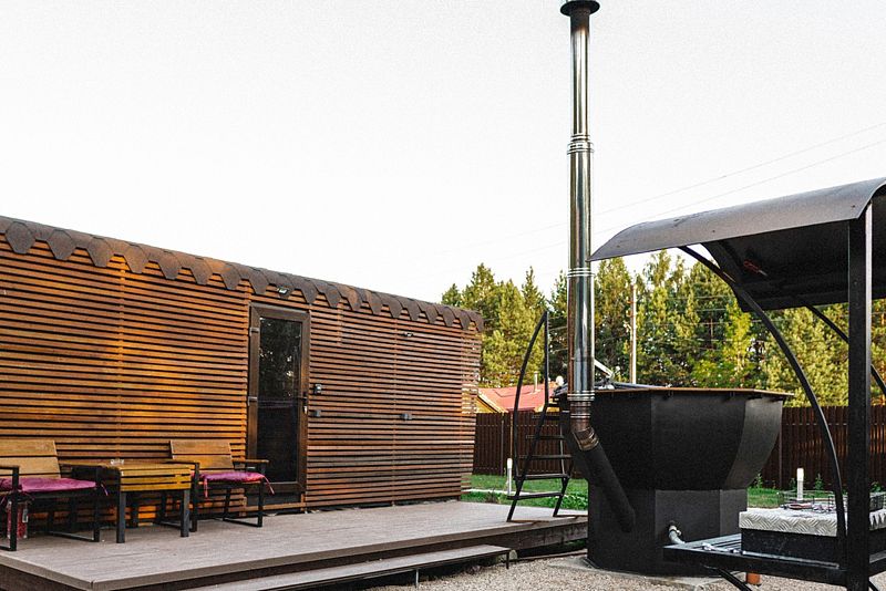 Для желающих расслабиться у каждого домика есть доступ к сибирскому банному чану, где горячая запарка из трав наполняет воздух успокаивающими ароматами. На террасе созданы условия для непринужденного общения: удобная мебель и теплые пледы создают атмосферу уюта под открытым небом.