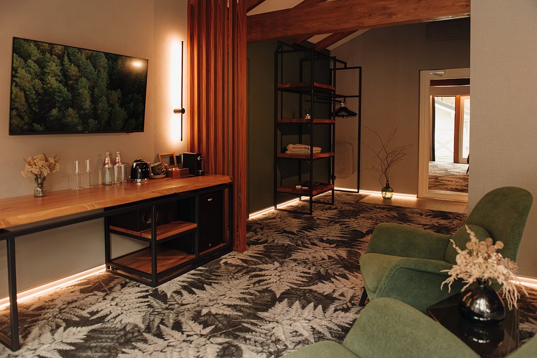 В каждом номере имеется: двуспальная кровать, прикроватные столики, телевизор, рабочее место, чайная и кофейная станция, кресла, шкаф, отдельный с/у, душевая, багажное отделение, ванные принадлежности, халаты и тапочки, система умный дом, уличная мебель, обслуживание номеров, меню подушек, письменные принадлежности.
