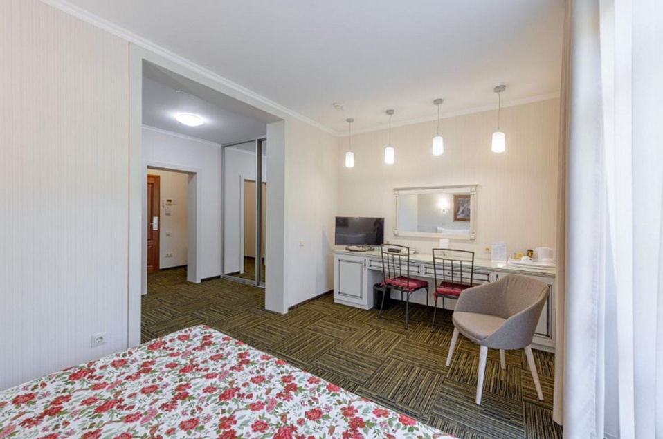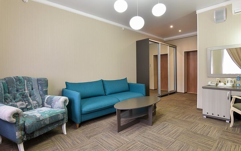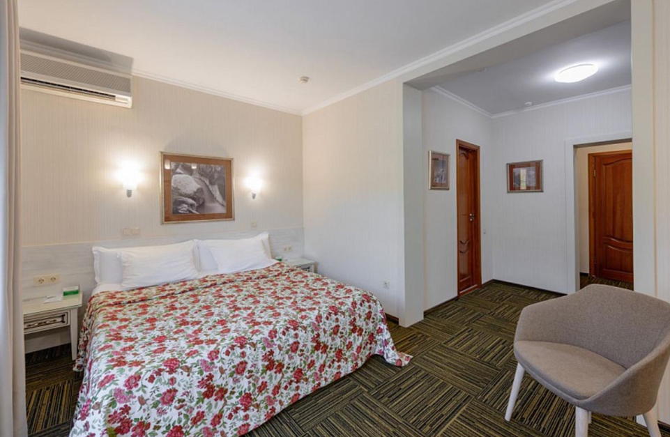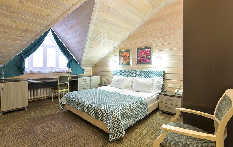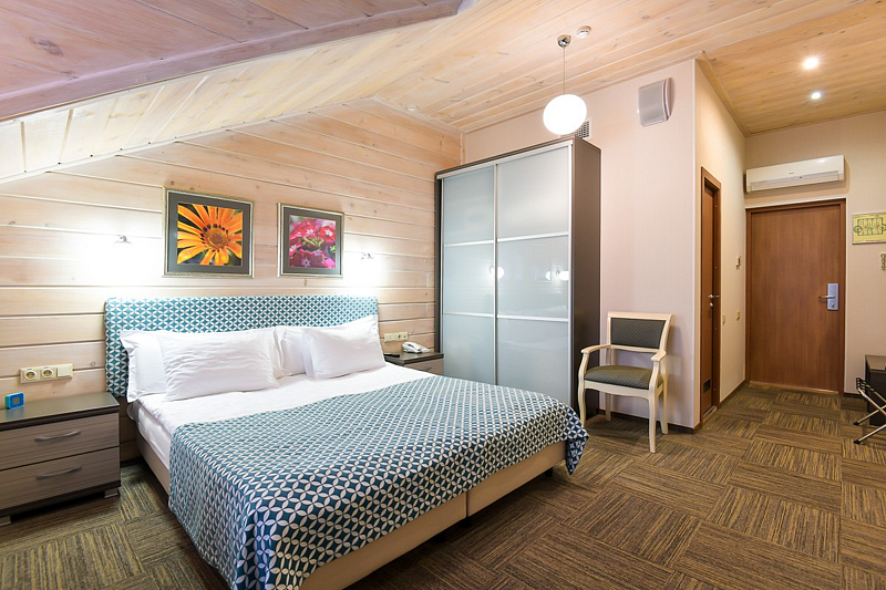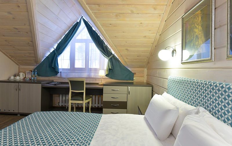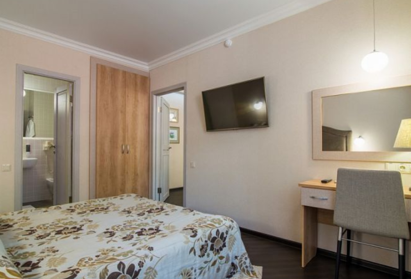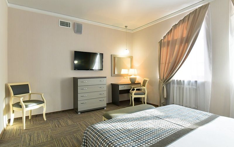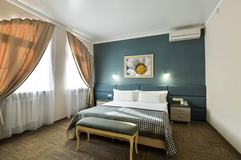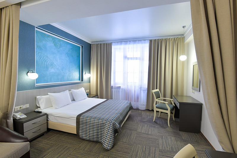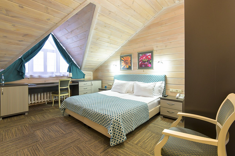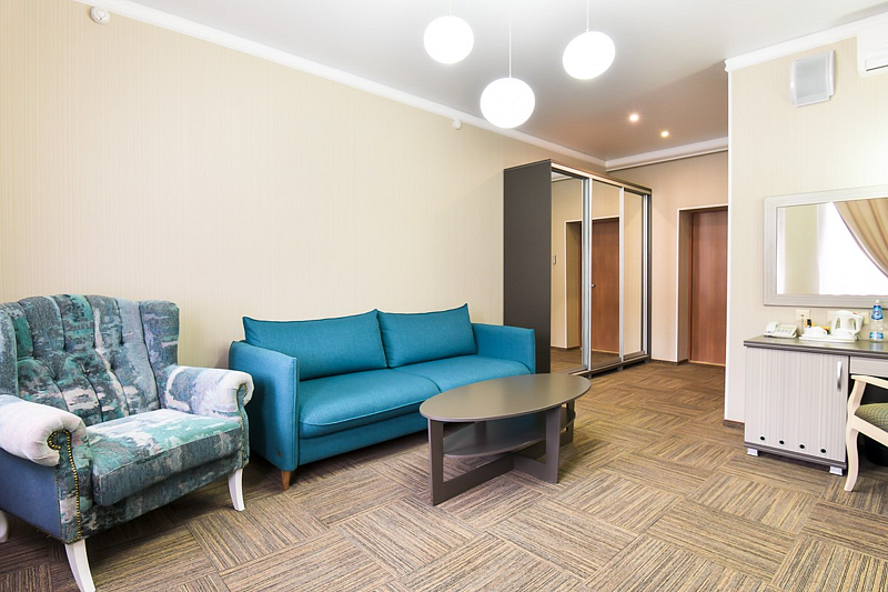 Люкс — уютный двухкомнатный номер, состоящий из комфортной спальни с двумя односпальными кроватями, по желанию гостей трансформирующимися в одну двухспальную, оснащенные ортопедическими матрасами, и гостиной, в которой есть уютный диванчик, письменный и журнальный столы, стул, вместительный гардероб.