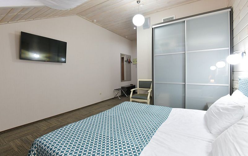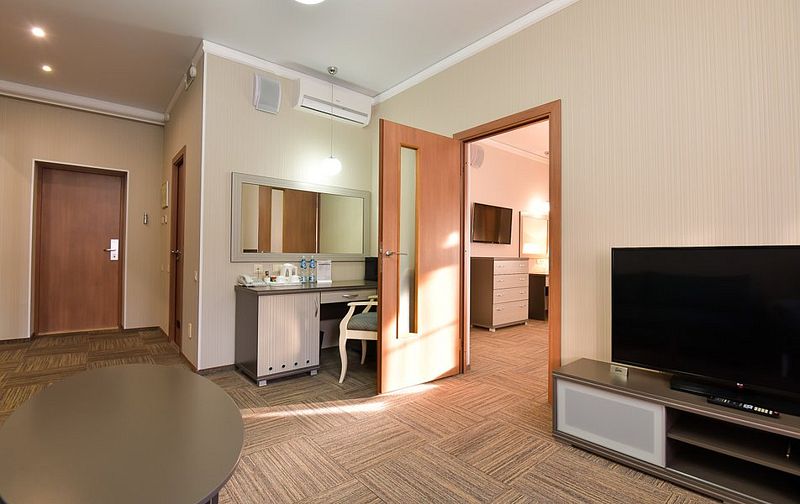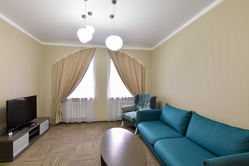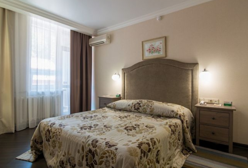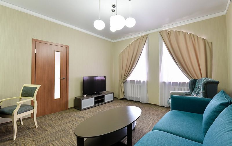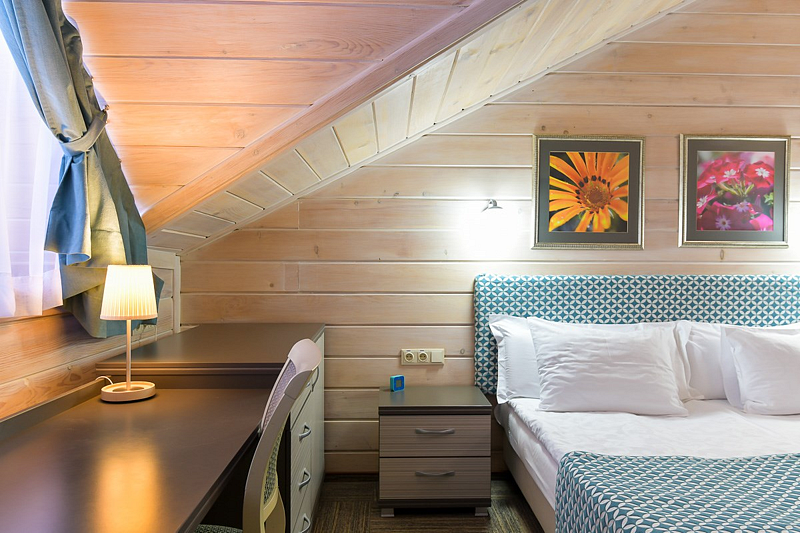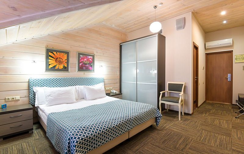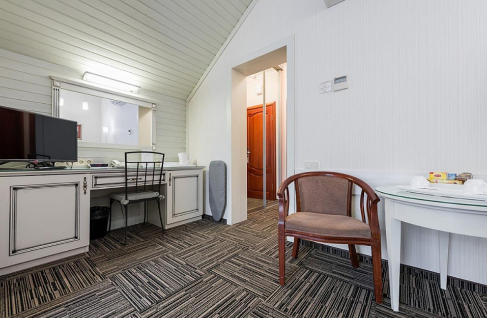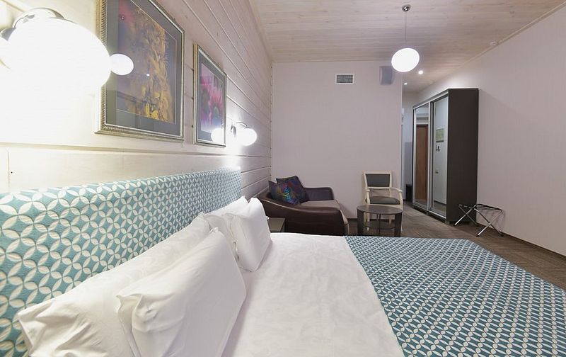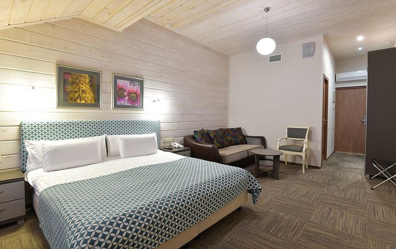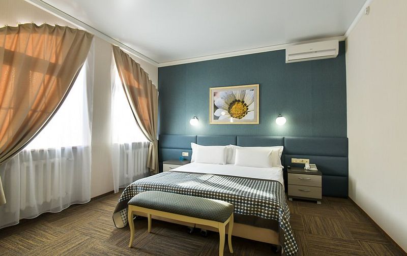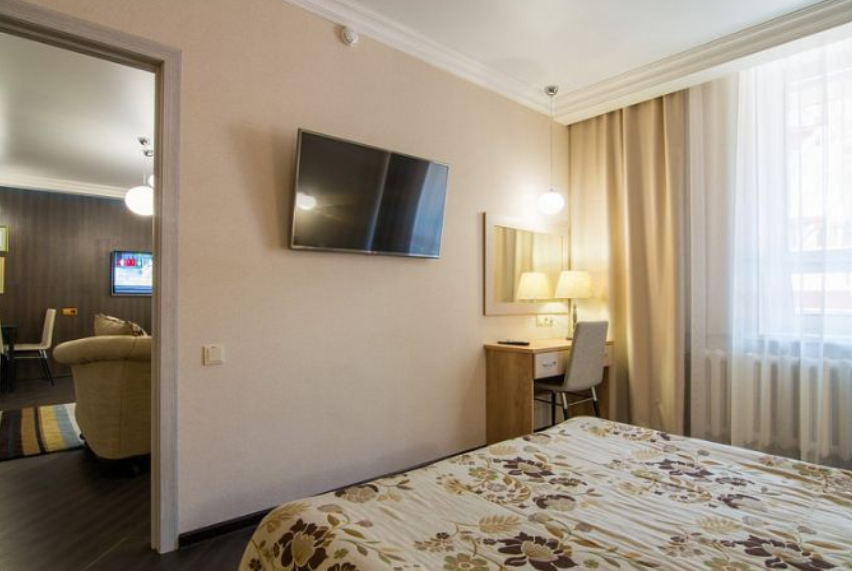 Люкс — уютный двухкомнатный номер, состоящий из комфортной спальни с двумя односпальными кроватями, по желанию гостей трансформирующимися в одну двухспальную, оснащенные ортопедическими матрасами, и гостиной, в которой есть уютный диванчик, письменный и журнальный столы, стул, вместительный гардероб.