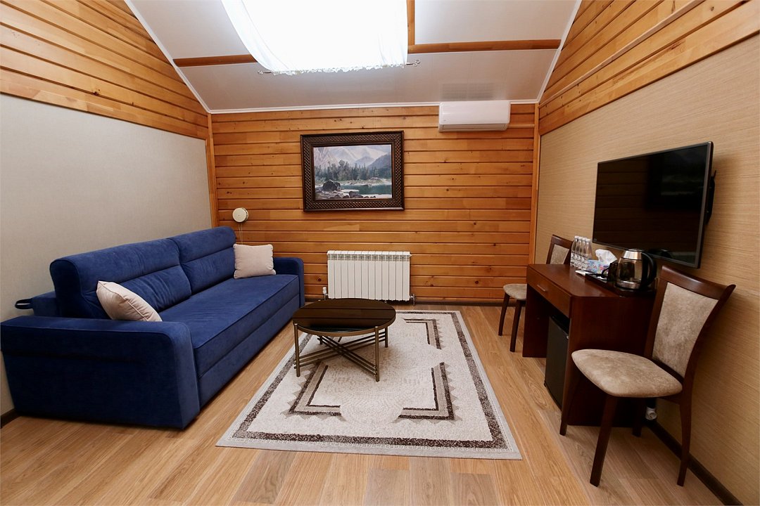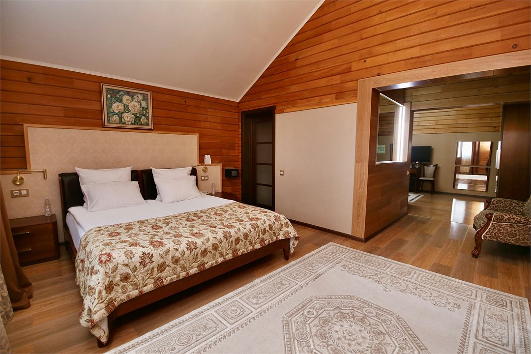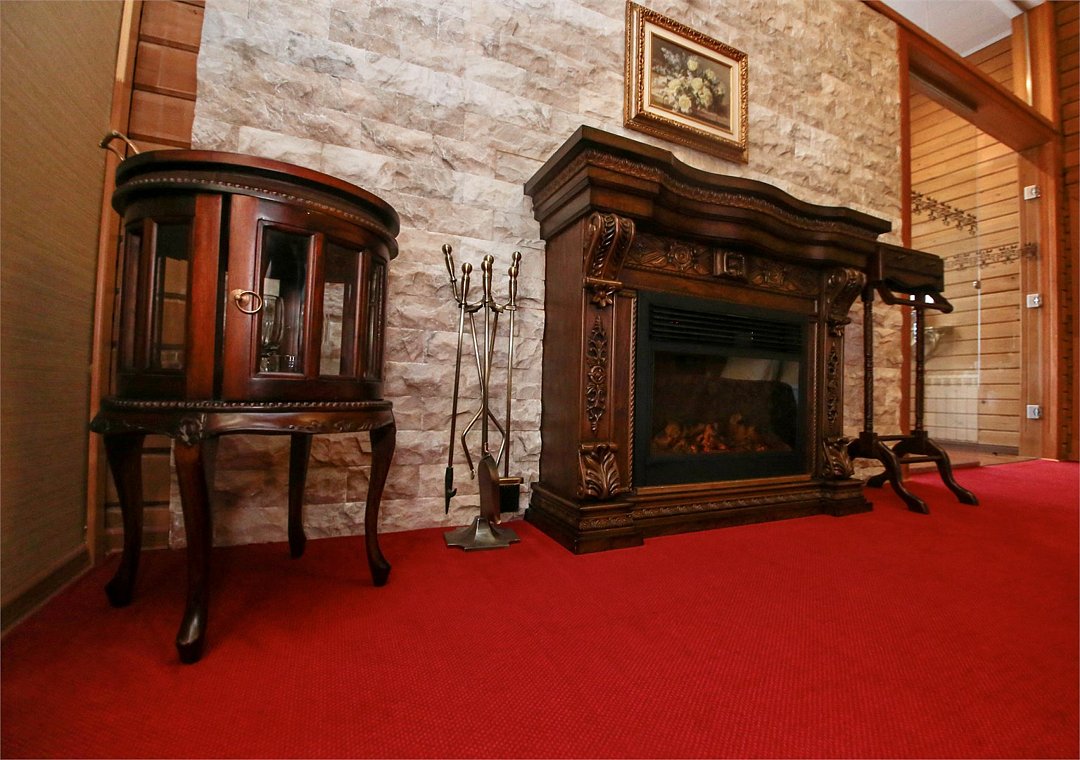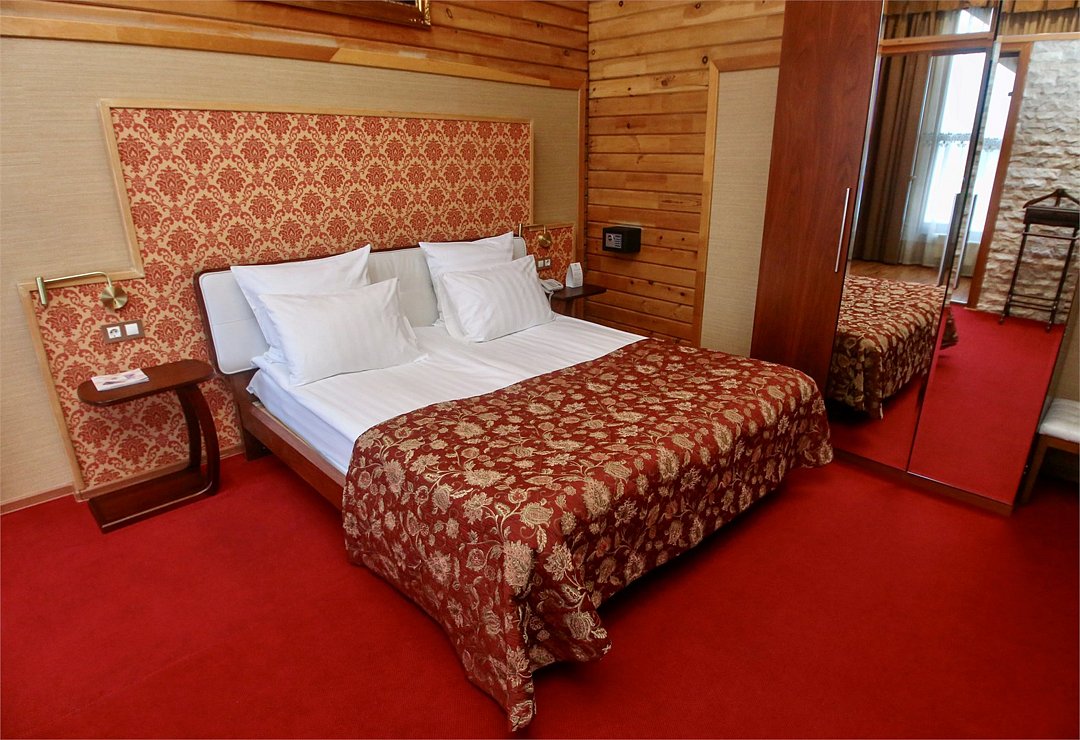 Большой двухместный номер повышенной комфортности с камином. МЕБЕЛЬ В НОМЕРЕ Двухспальная кровать (200 см х 220 см) Прикроватные тумбочки Платяной шкаф Рабочий стол Возможность установки детской кроватки или допместа УСЛУГИ И УДОБСТВА Кондиционер, ковровое покрытие, мини-холодильник, чайные принадлежности. Халаты и тапочки, полотенца, туалетные принадлежности. WC: джакузи, биде, раковина, фен, косметическое зеркало. LCD телевизор 55", спутниковые каналы, телефон.Услуги и удобства