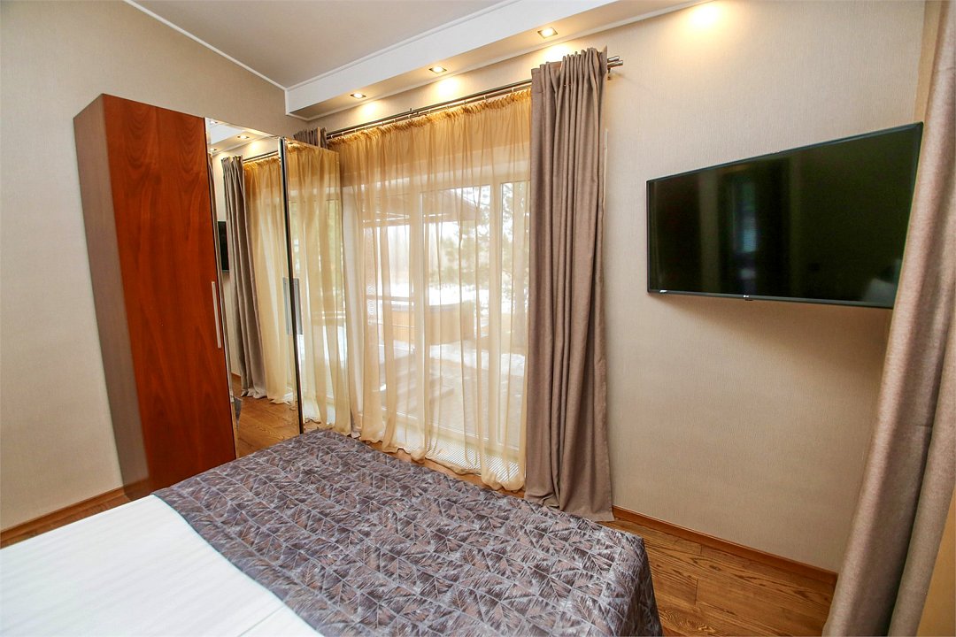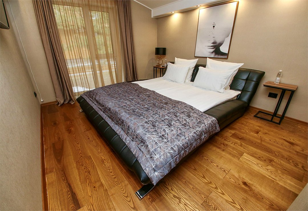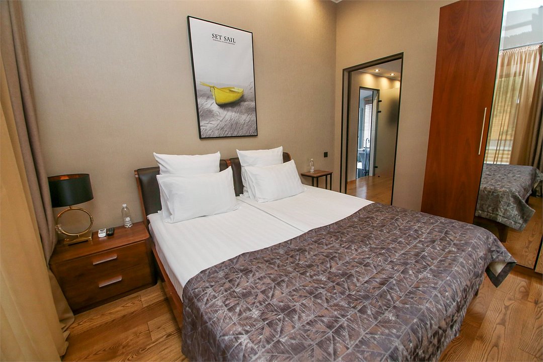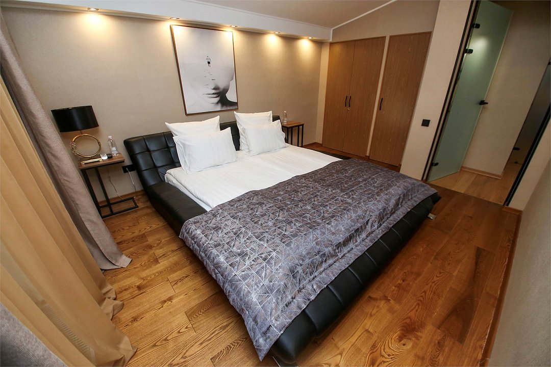 Двухкомнатный номер, площадью 43 квадратных метра. ПЕРВАЯ КОМНАТА LCD телевизор 47", спутниковые каналы, шкаф, стол письменный, стулья, диван, мини холодильник, мини бар. ВТОРАЯ КОМНАТА LCD телевизор 47",спутниковые каналы, 2х-спальная кровать, тумбочки, телефон. WC Раковина, душ, набор душевых принадлежностей.Услуги и удобства