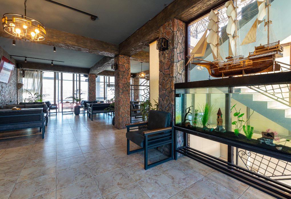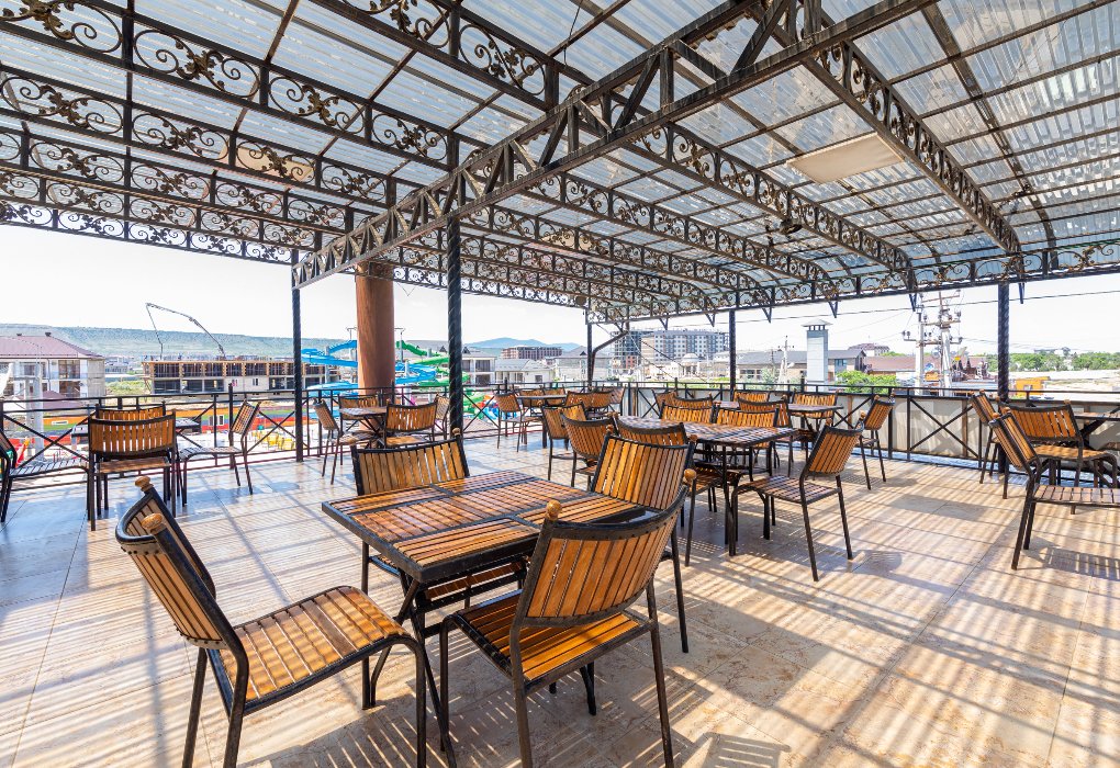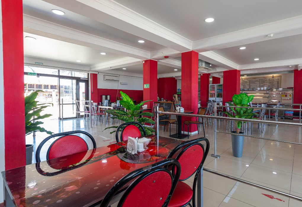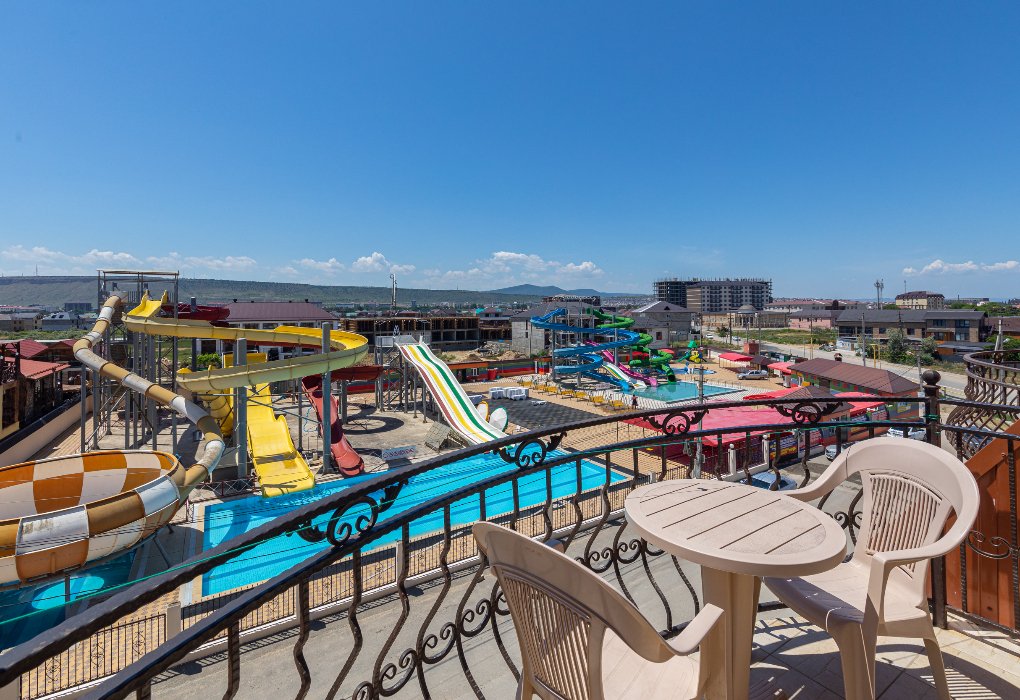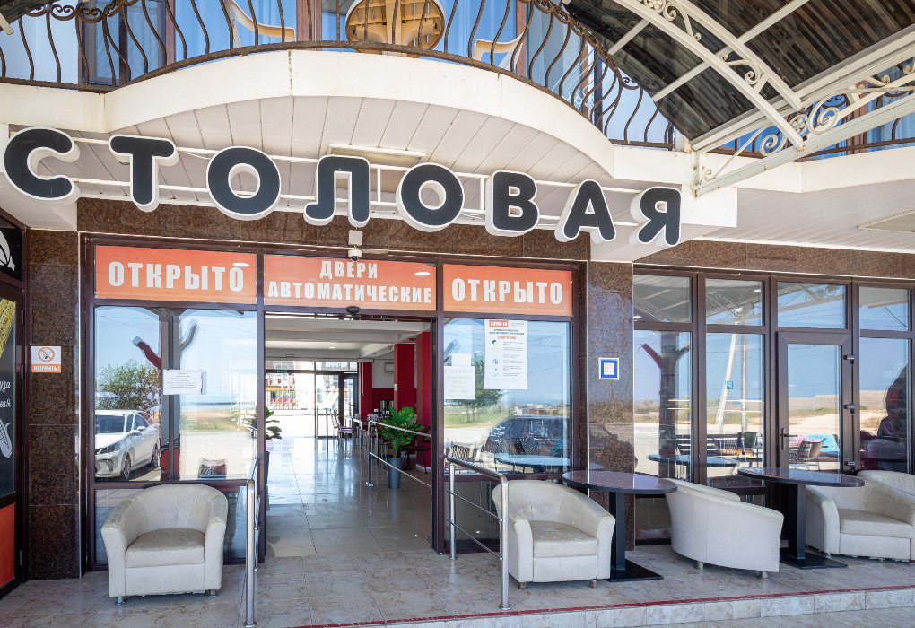 В том же здании столовая, где проходят завтраки, ресторан «Океан» и продуктовый магазинчик. До города только на такси. Пляж и аквапарк совсем рядом. -