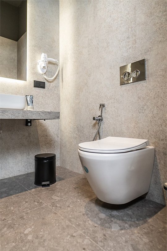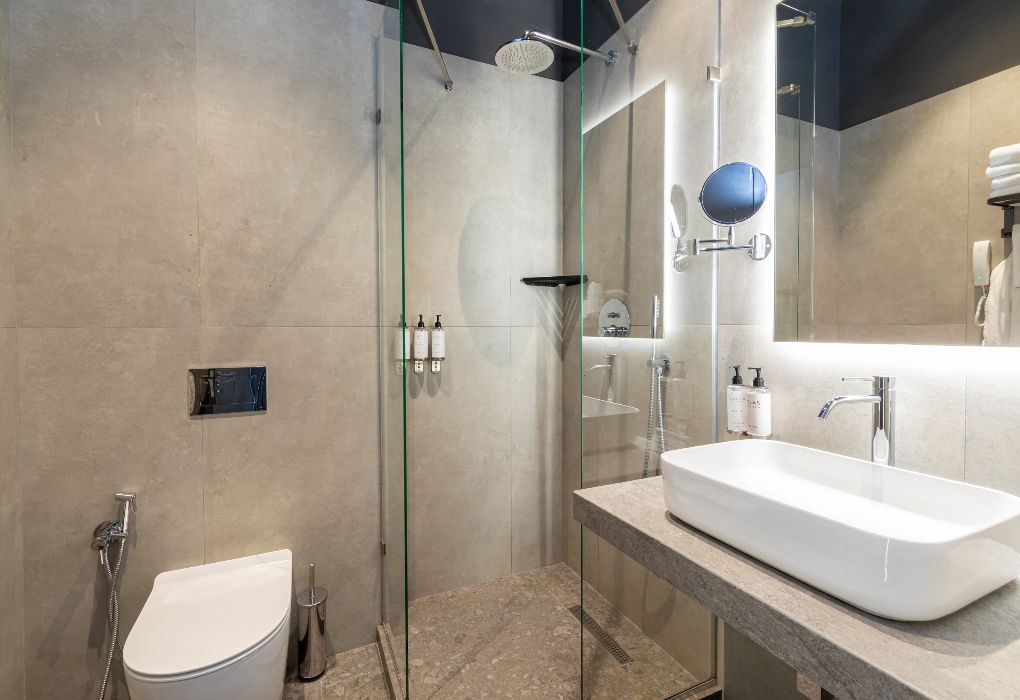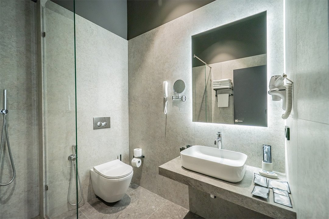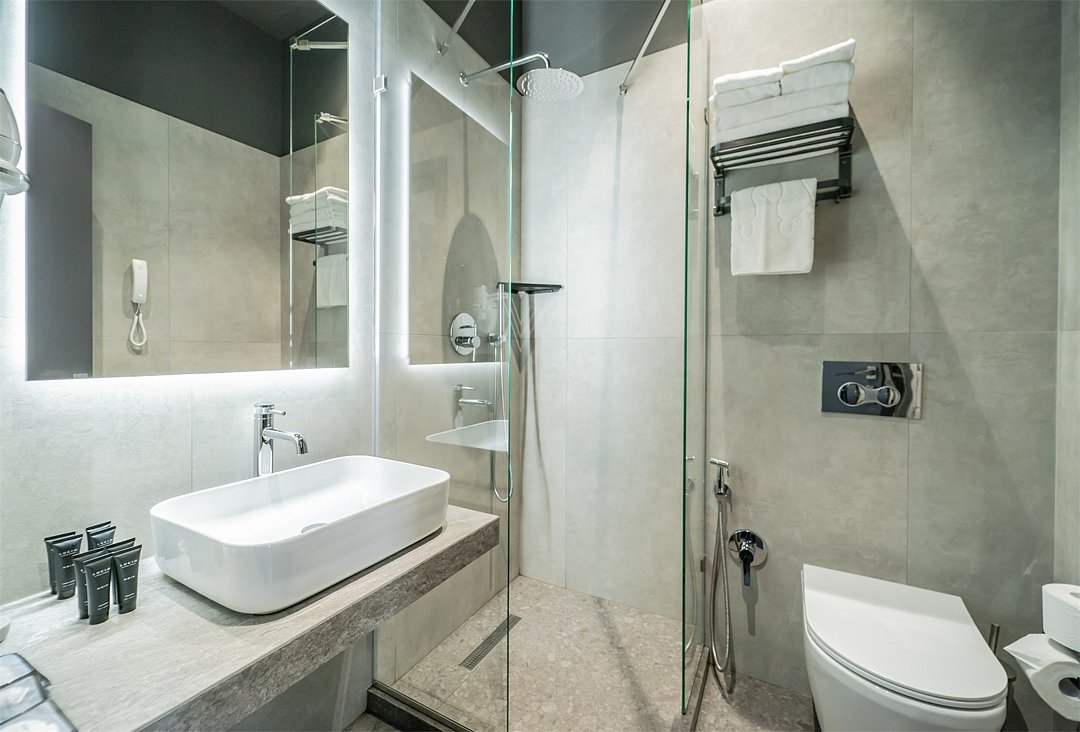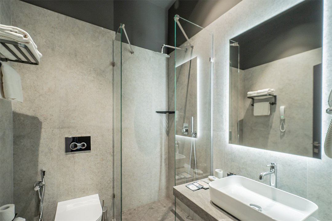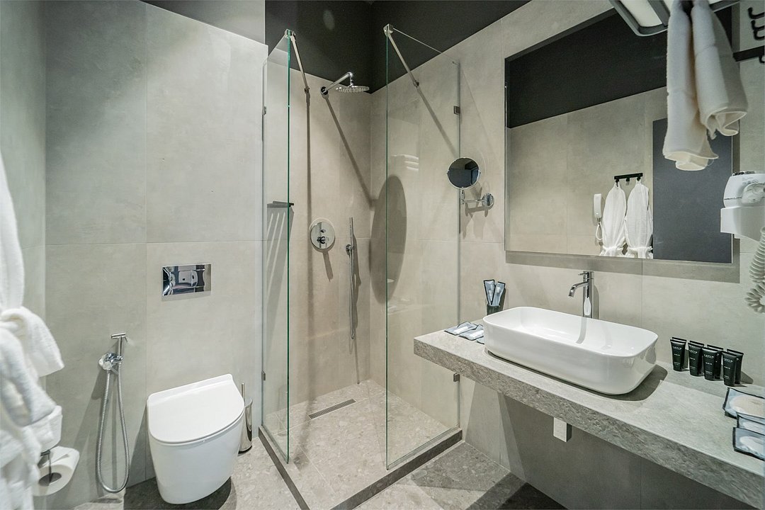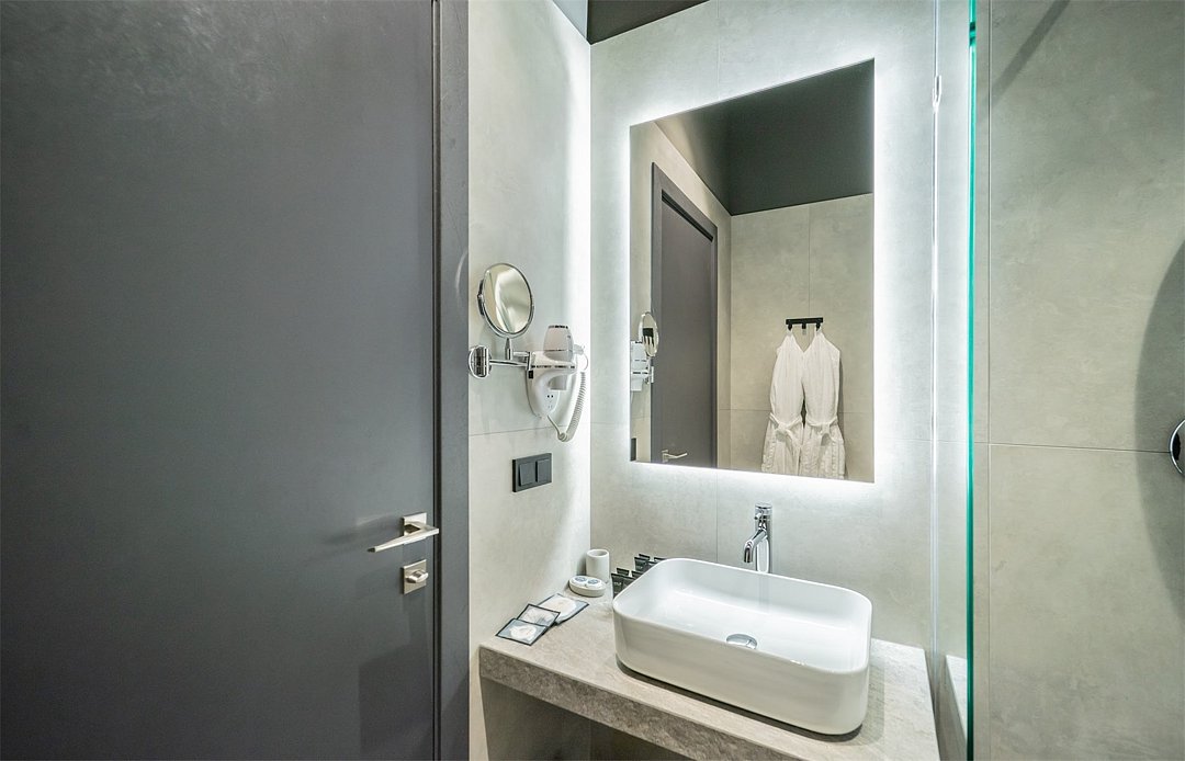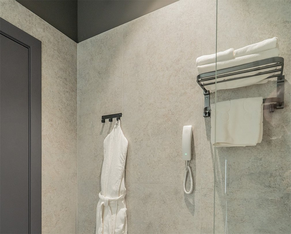 Кондиционер для создания идеального микроклимата, телевизор с системой Android TV, стильная ванная комната с душевой кабиной, фен и набор косметических принадлежностей (шампунь, гель для душа, мыло, также по запросу предоставляются зубной, бритвенный, косметический наборы), мягкие халаты и тапочки.