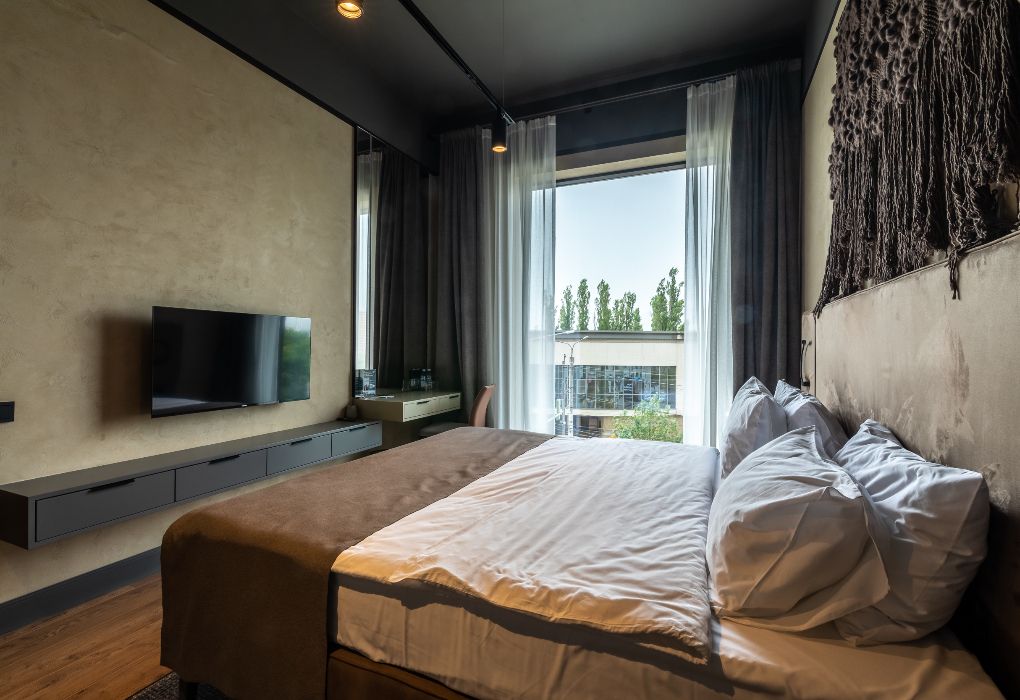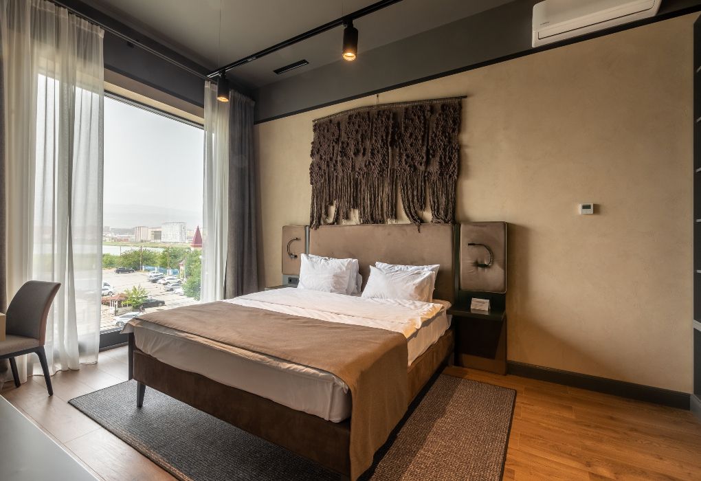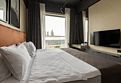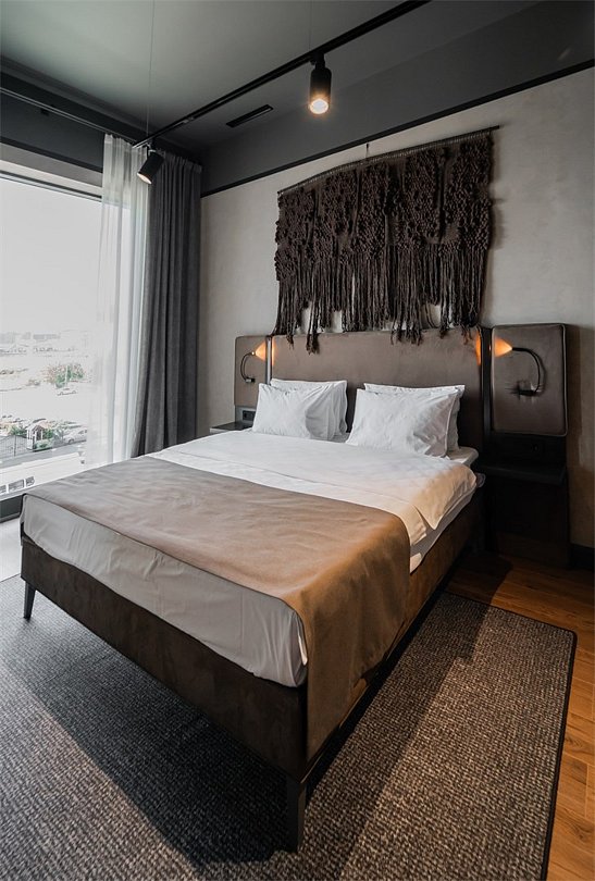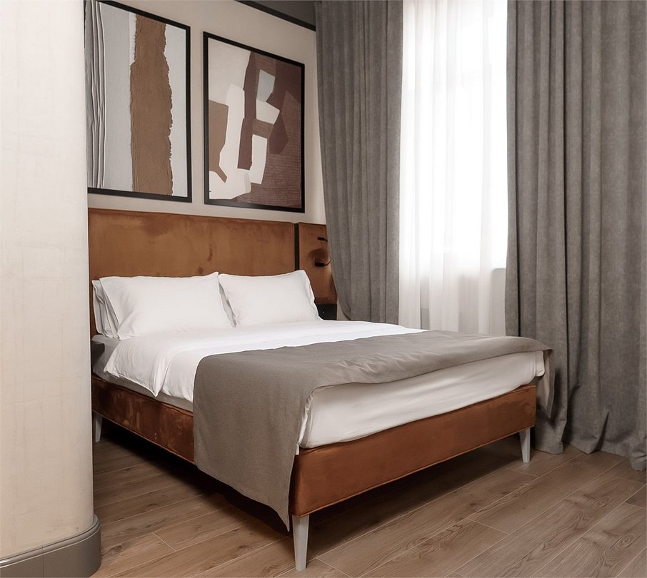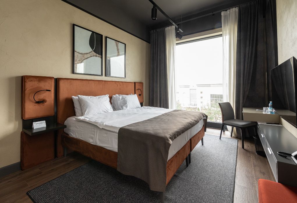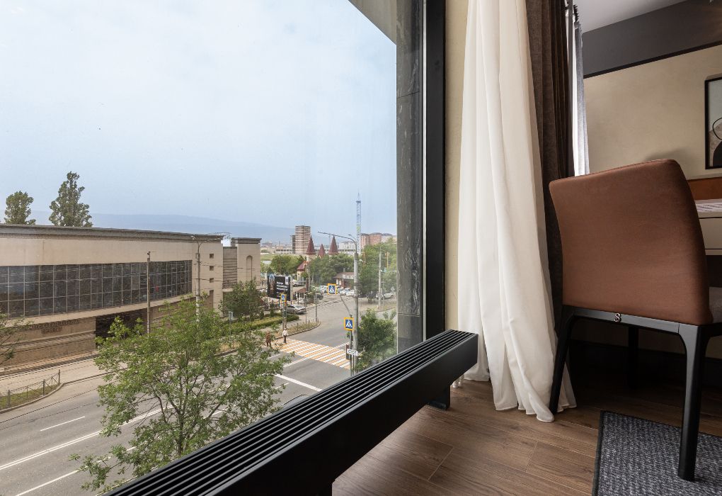 Двухместный номер Делюкс сочетает в себе современный минимализм и уютную атмосферу. Интерьер выполнен в теплых бежево-коричневых тонах, которые создают ощущение комфорта и гармонии. Панорамные окна наполняют номер естественным светом и открывают вид на проспект Петра I, добавляя пространству легкости и изысканности.