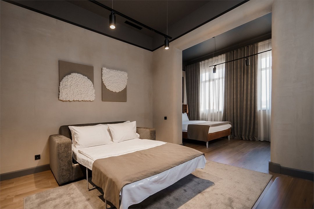 Двухкомнатный Люкс Yamaguchi идеально подойдет гостям, которые ценят роскошь, комфорт и внимание к деталям. Номер площадью 52 м² состоит из просторной спальни и элегантной гостиной с панорамным окном, из которого открывается вид на проспект Петра I.