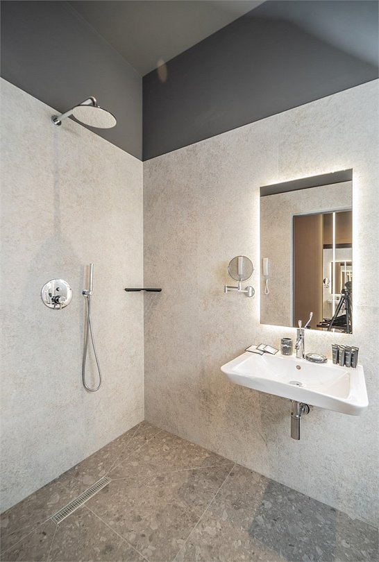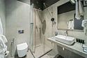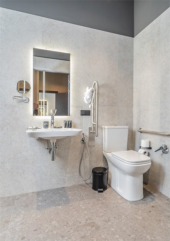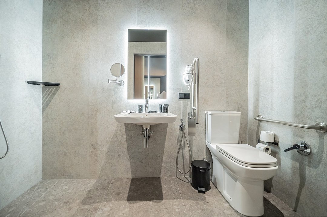 Сециально оборудованная ванная комната с душевой кабиной и санузлом, адаптированными для маломобильных гостей, фен и набор косметических принадлежностей (шампунь, гель для душа, мыло, также по запросу предоставляются зубной, бритвенный, косметический наборы), мягкие халаты и тапочки.
