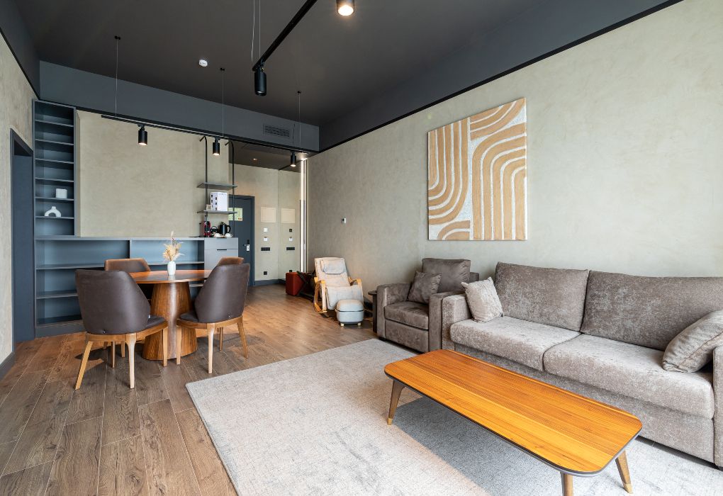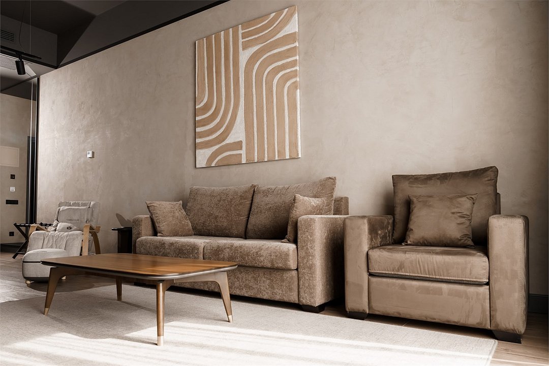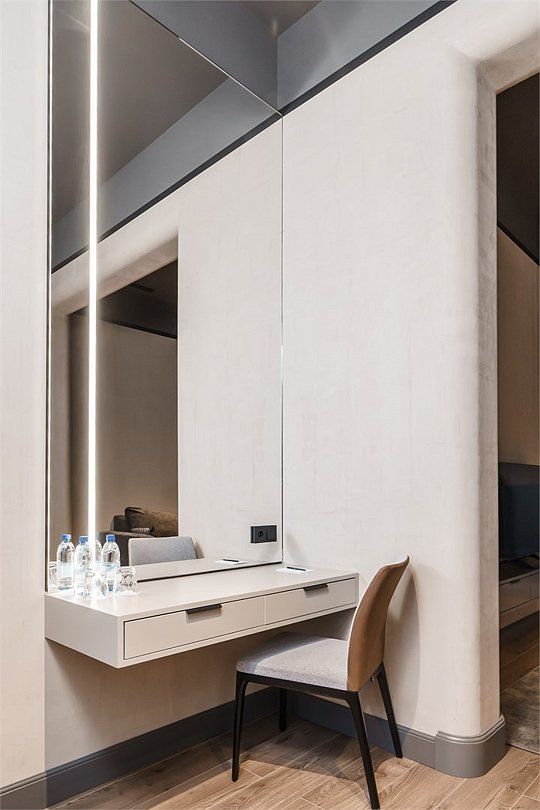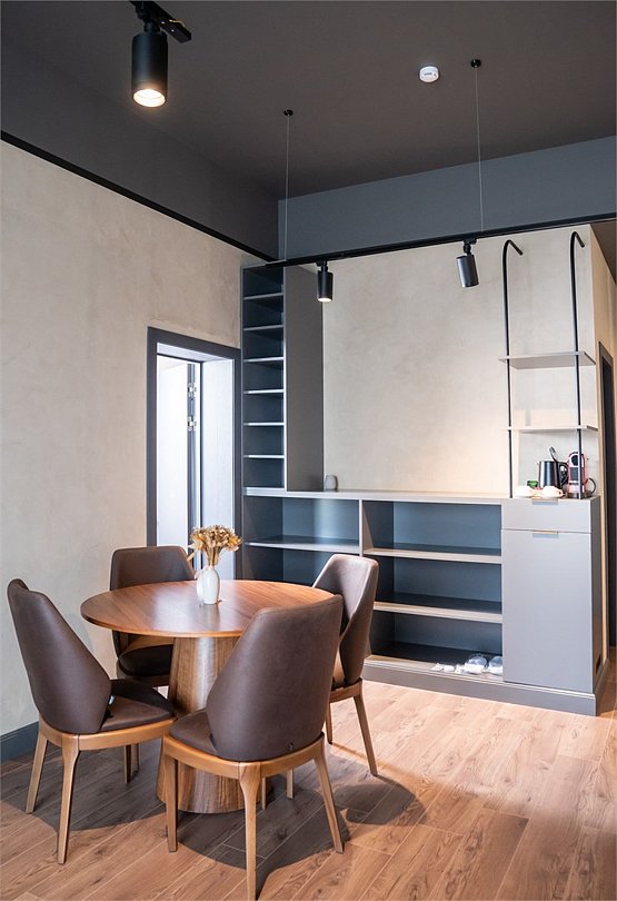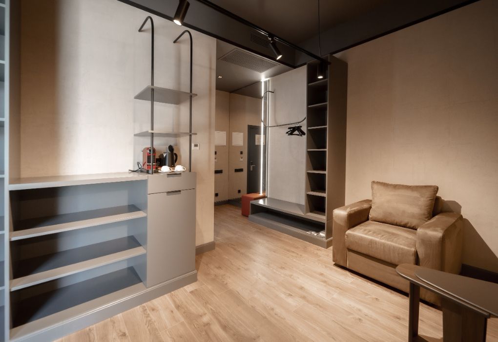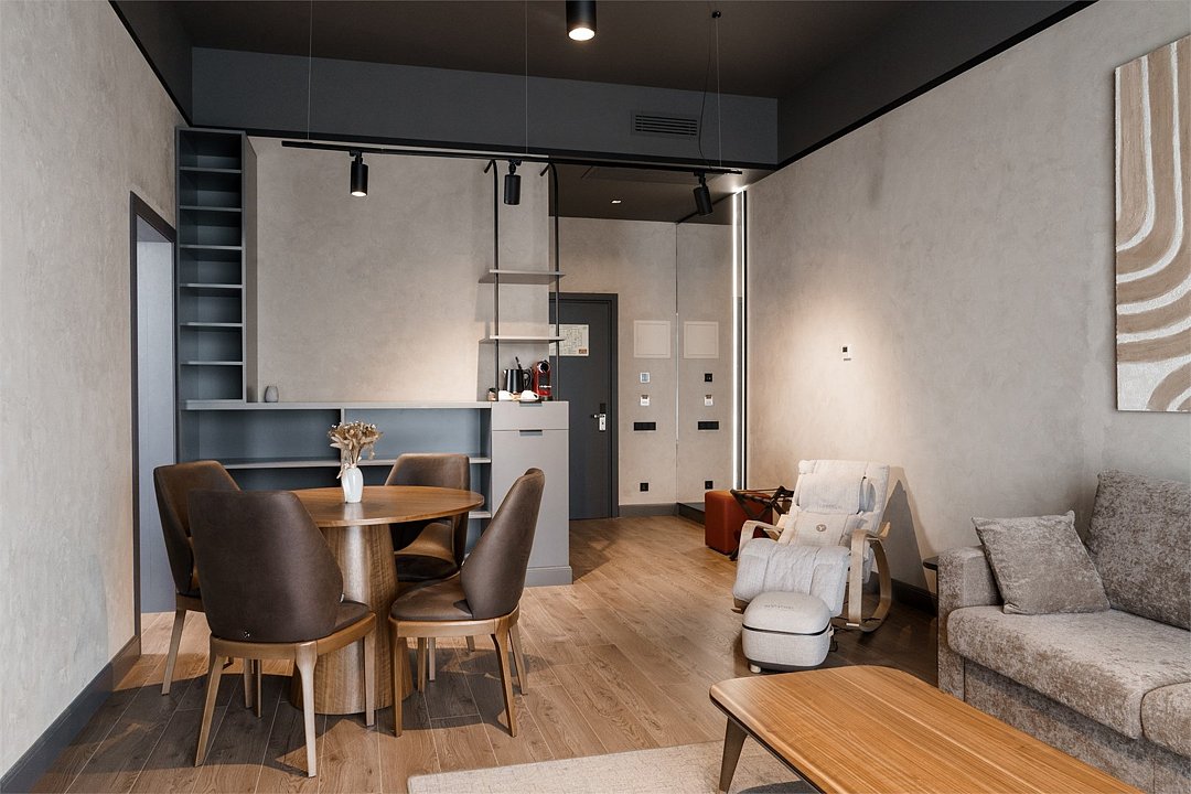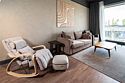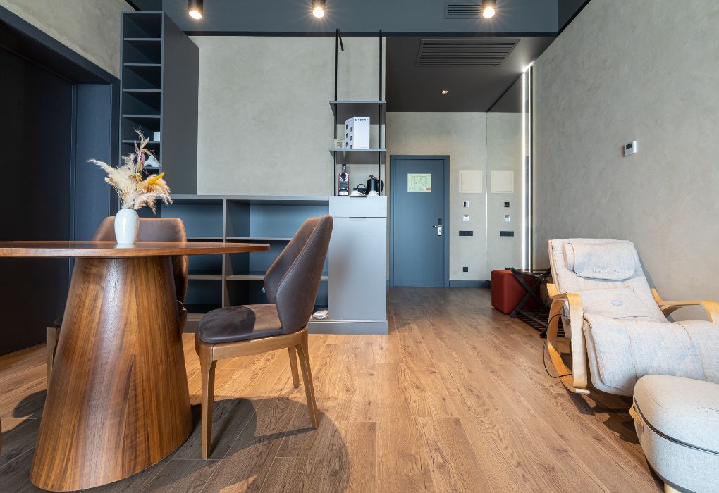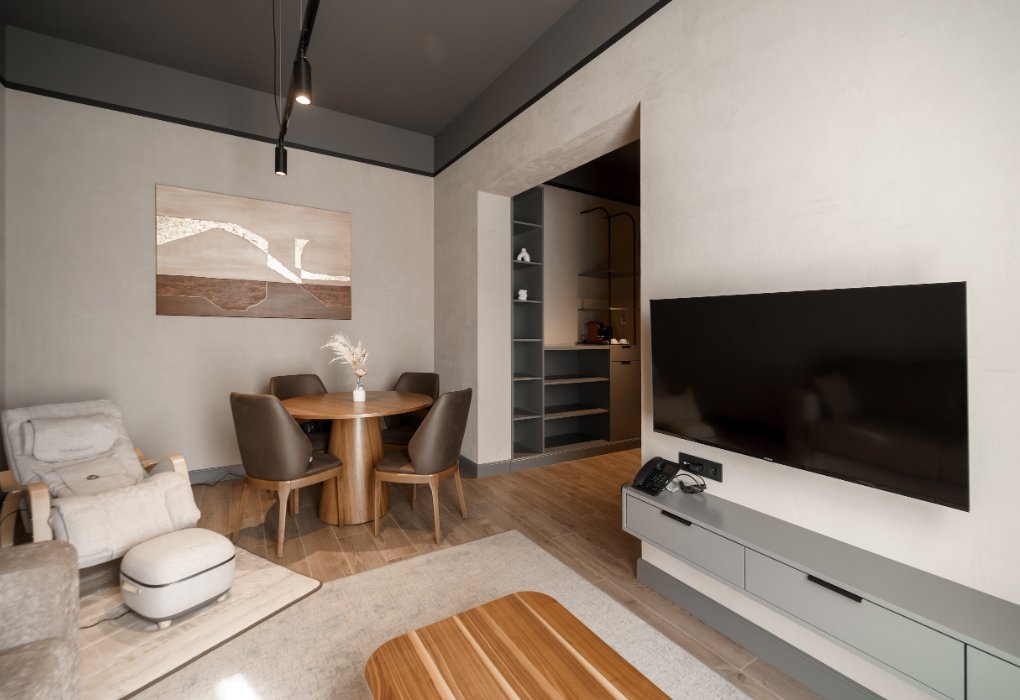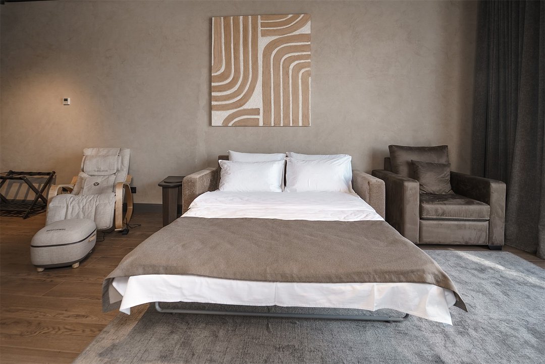 Интерьер выполнен в сдержанных тонах с акцентами на натуральных материалах, создающих атмосферу уюта и изысканности. Главная особенность номера — массажное кресло и массажер для стоп от фирмы Yamaguchi, которые помогут вам расслабиться после насыщенного дня и насладиться профессиональным массажем, не выходя из номера.