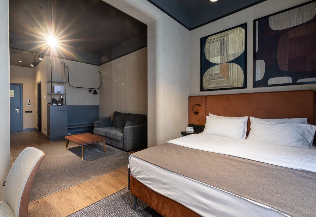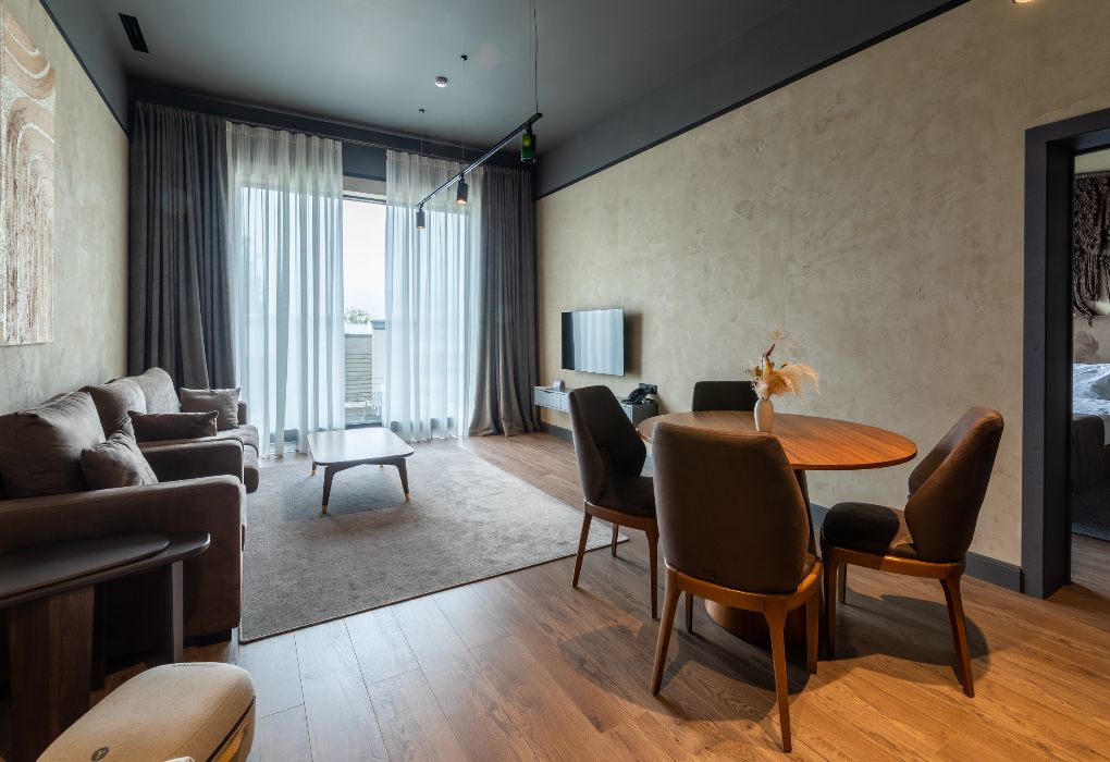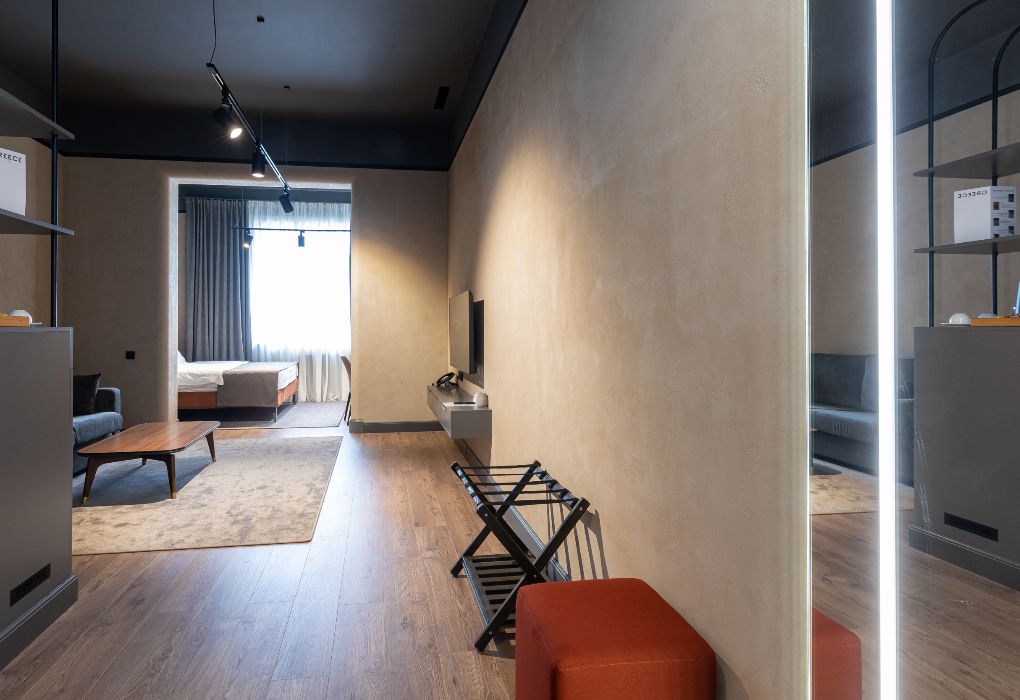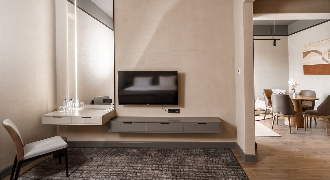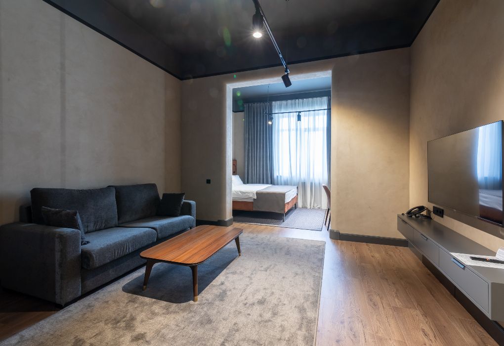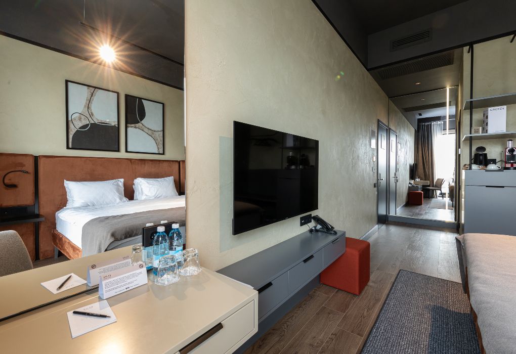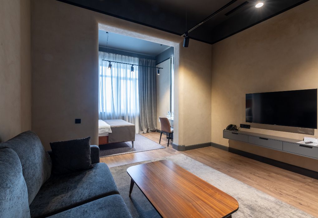 Двуспальная кровать Queen-Size 160x200 см, раскладной диван 135х180 см, бесплатный мини-бар с безалкогольными напитками, чайник и чайная станция с набором чаев, капсульная кофемашина для любителей ароматного кофе, сейф для хранения ценных вещей, кондиционер для создания идеального микроклимата, телевизор с системой Android TV.