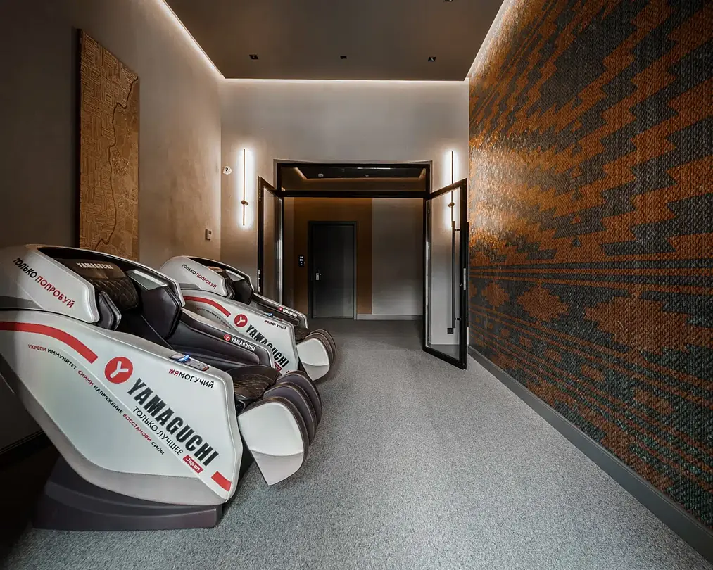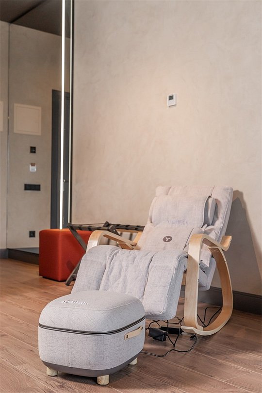Интерьер выполнен в сдержанных тонах с акцентами на натуральных материалах, создающих атмосферу гармонии и спокойствия. Главная особенность номера — массажное кресло и массажер для стоп от фирмы Yamaguchi, которые помогут вам расслабиться после насыщенного дня и насладиться профессиональным массажем, не выходя из номера.