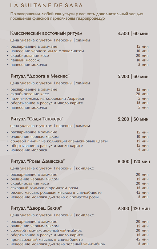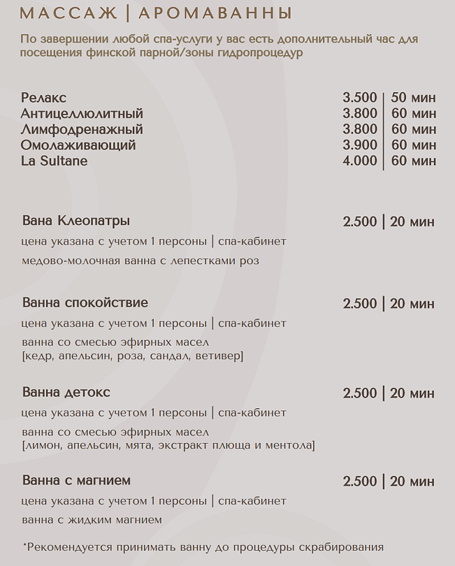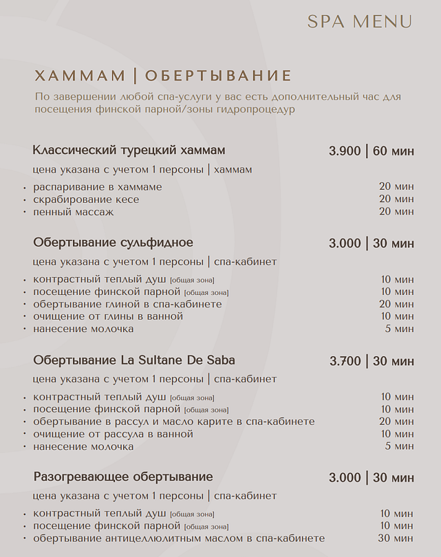 - классический турецкий хаммам (после 12:30) — 3900 ₽/час с человека.